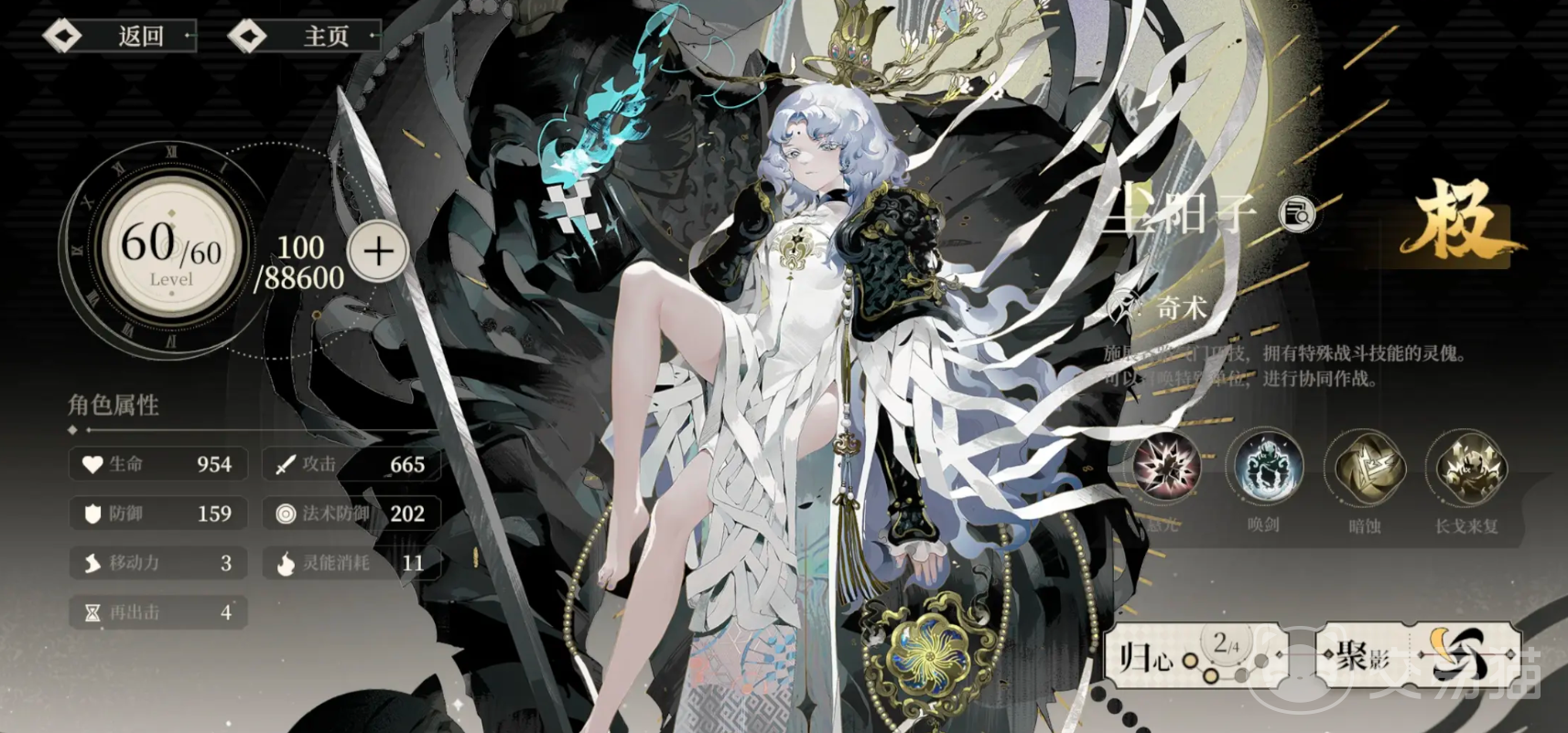 尘阳子的主动技悬光,能让他在攻击目标的时候造成100%法术伤害的同时驱散这位敌人身上的增益状态,他的灵能技唤剑,能在空格位置召唤一位灵能武士,并在召唤地点的相邻单位造成100%的法术伤害,这位灵能武士会继承尘阳子50%的生命值,并造成法术伤害推动目标。