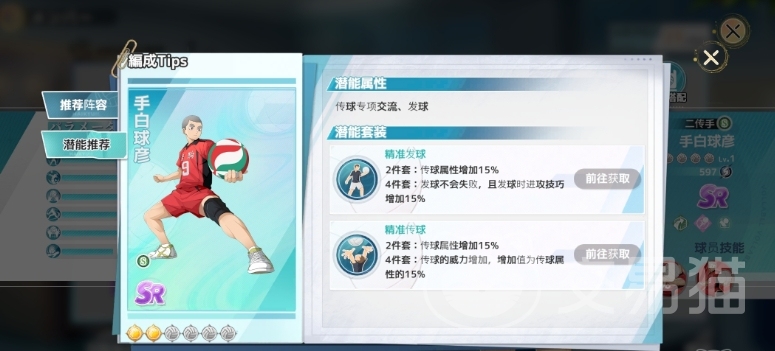 对于新手玩家来说,在游戏的早期阶段,除了要关注强力的副攻手橙卡之外,也应该注意收集像手白这样的紫卡二传手球员,至少后期培养之后这类角色能够给全队的克制属性带来一个压制效果,所以从定位上面来看手白球彦在游戏中中就是一个非常有价值的角色,他的发球、接球和传球能力都有不错的潜力,而且能够很好地融入各种阵容之中,虽然在某些方面存在不足,但只要大家合理搭配,就可以让他所在的队伍得到更高的增益哦。