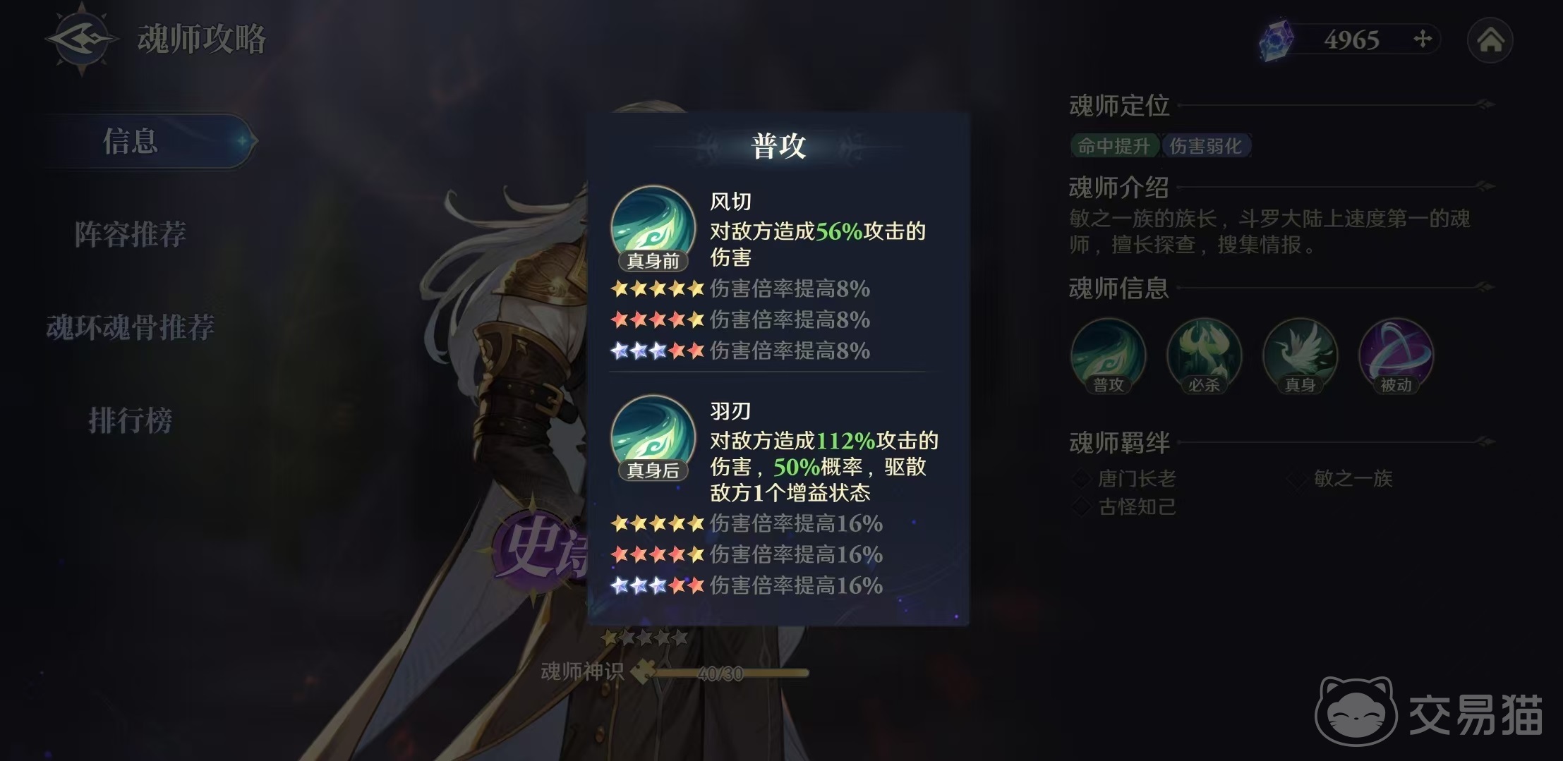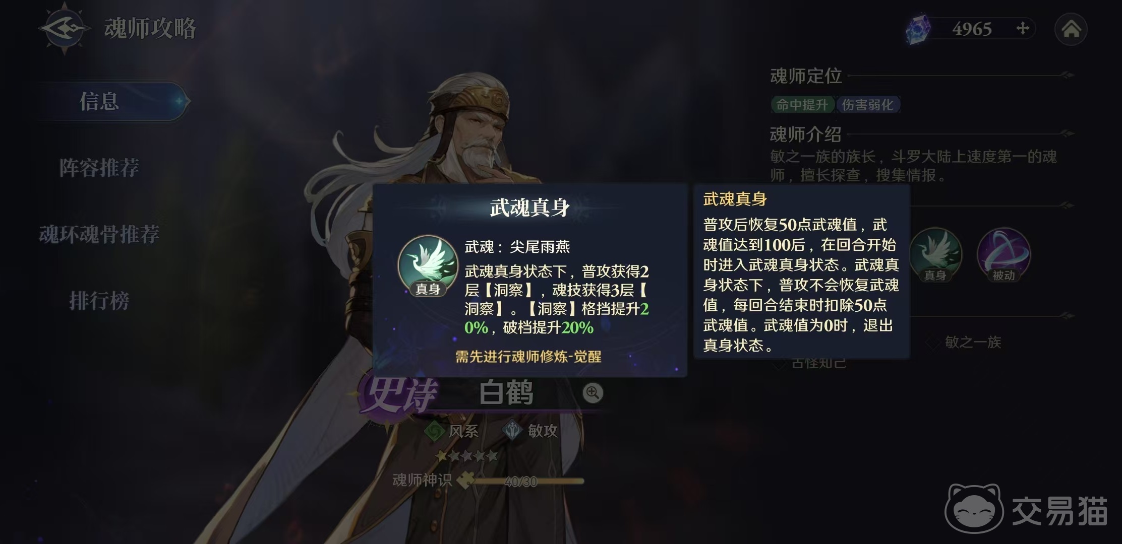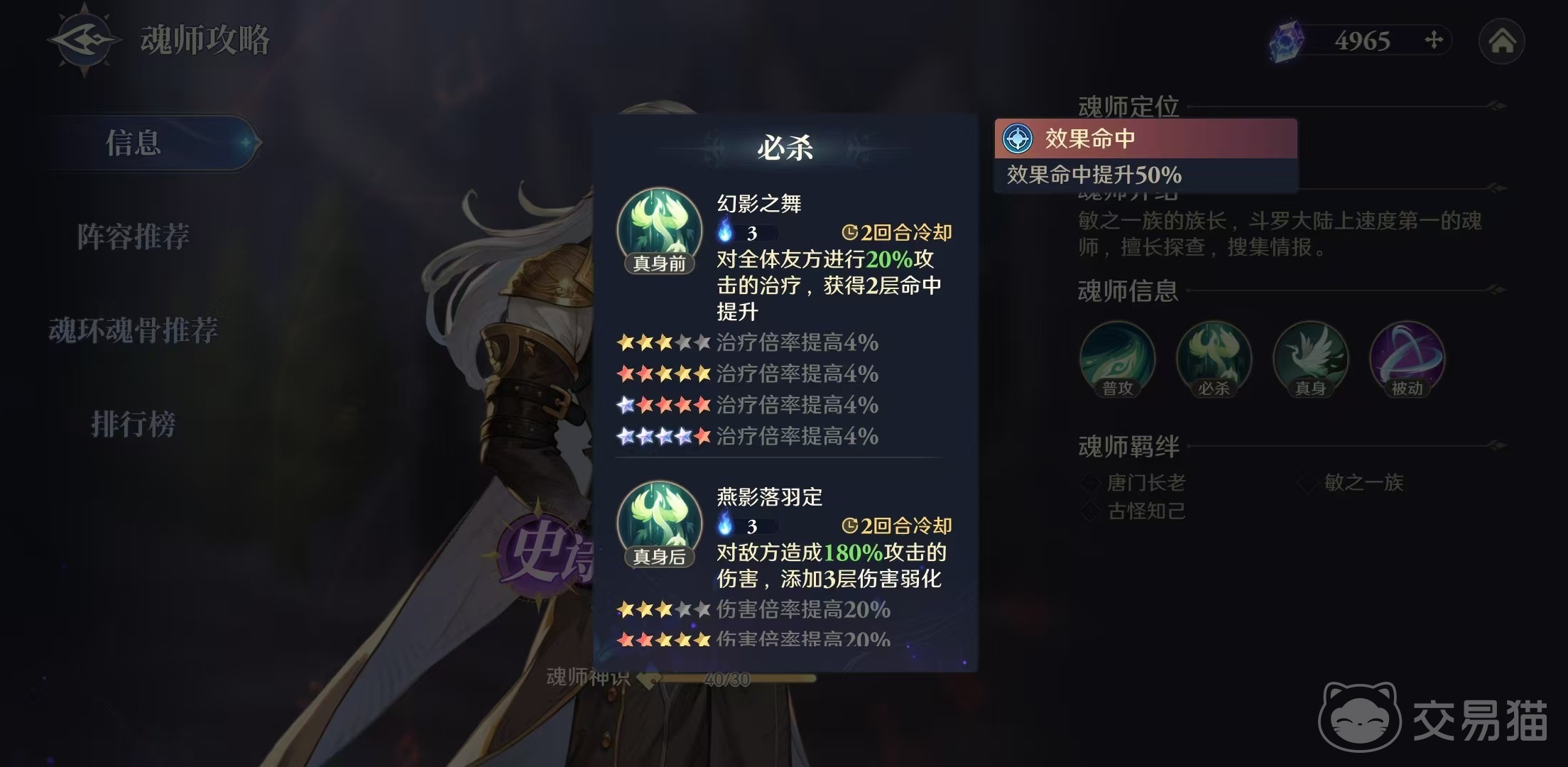 自身必杀为幻影之舞,对全体友方进行一次20%攻击力的治疗,并获得两层命中提升效果。在武魂真身之后必杀技变为燕影落羽定,对敌方造成180%攻击伤害,并添加三层伤害弱化。可见必杀技在武魂前后的区别还是比较大的,但这两种都很有效果,提升命中可以帮助队友更好的输出,添加伤害弱化也是很好用的全局技能。自身的武魂真身为尖尾雨燕,在此状态下普攻将获得两层洞察,魂技获得三层洞察,每层洞察可以提升20%格挡和20%破挡。格挡很好理解就是挡住对方的攻击,破挡则是克制对方进行格挡,也是有利于输出的状态。