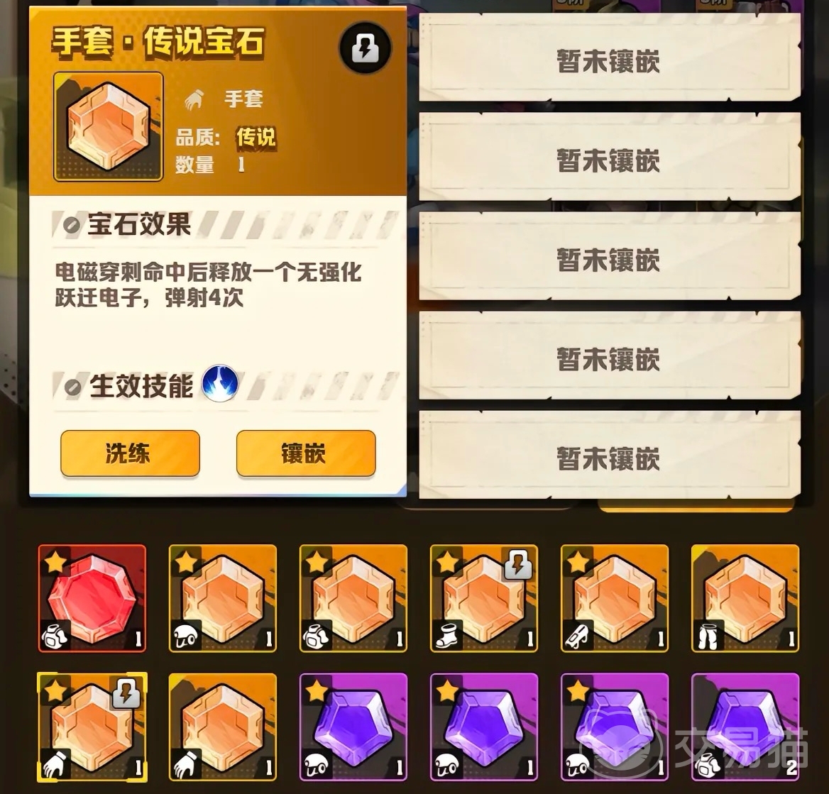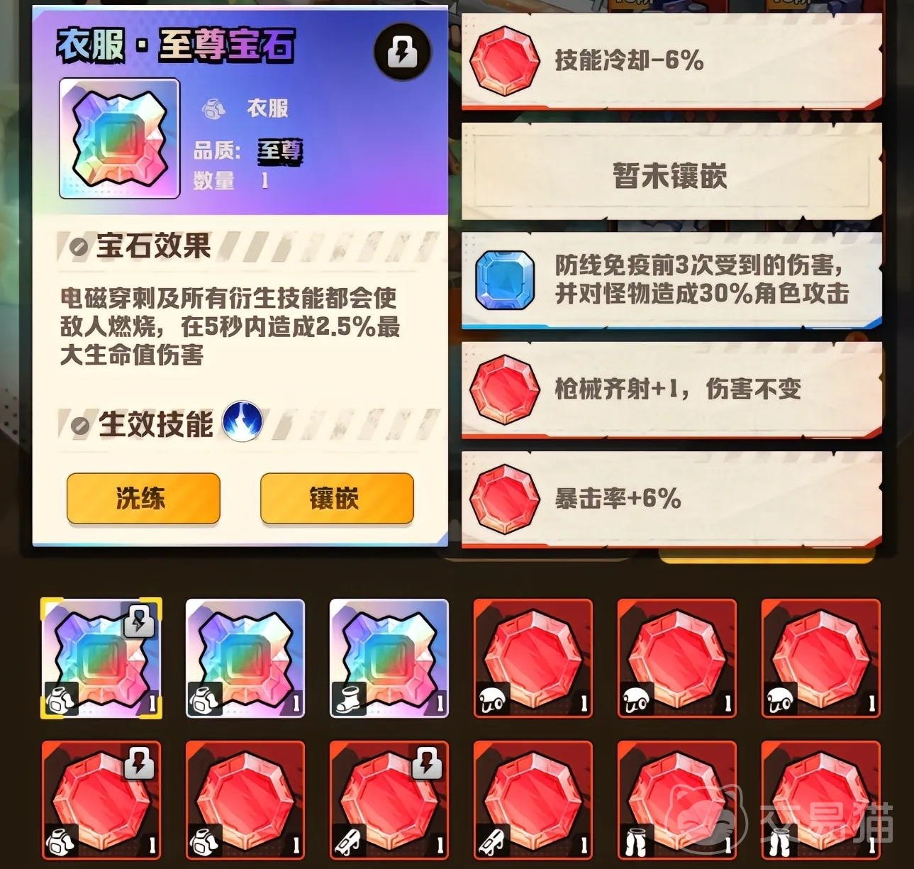 想让电磁穿刺攻击敌人也造成灼烧效果的话,衣服上面的宝石一定要携带至尊属性的电磁燃烧,所有的后置进阶技能都可以在该宝石的加成下附带百分比的燃烧效果,亲测搭配电磁命中效果非常棒;第二个宝石推荐杀死怪物之后减冷却,如果有至尊版本的更好,击杀怪物后期最高能够减少所有技能10%以上的冷却;最后一颗宝石推荐命中有概率额外触发一次电磁,这也是很多网上的博主都在教的无线电磁流,至尊宝石部位两个以上效果最佳;其他电磁系的宝石也可以携带越迁额外初始一次以及路径对敌人造成额外伤害,不用最高的至尊品质也能用。