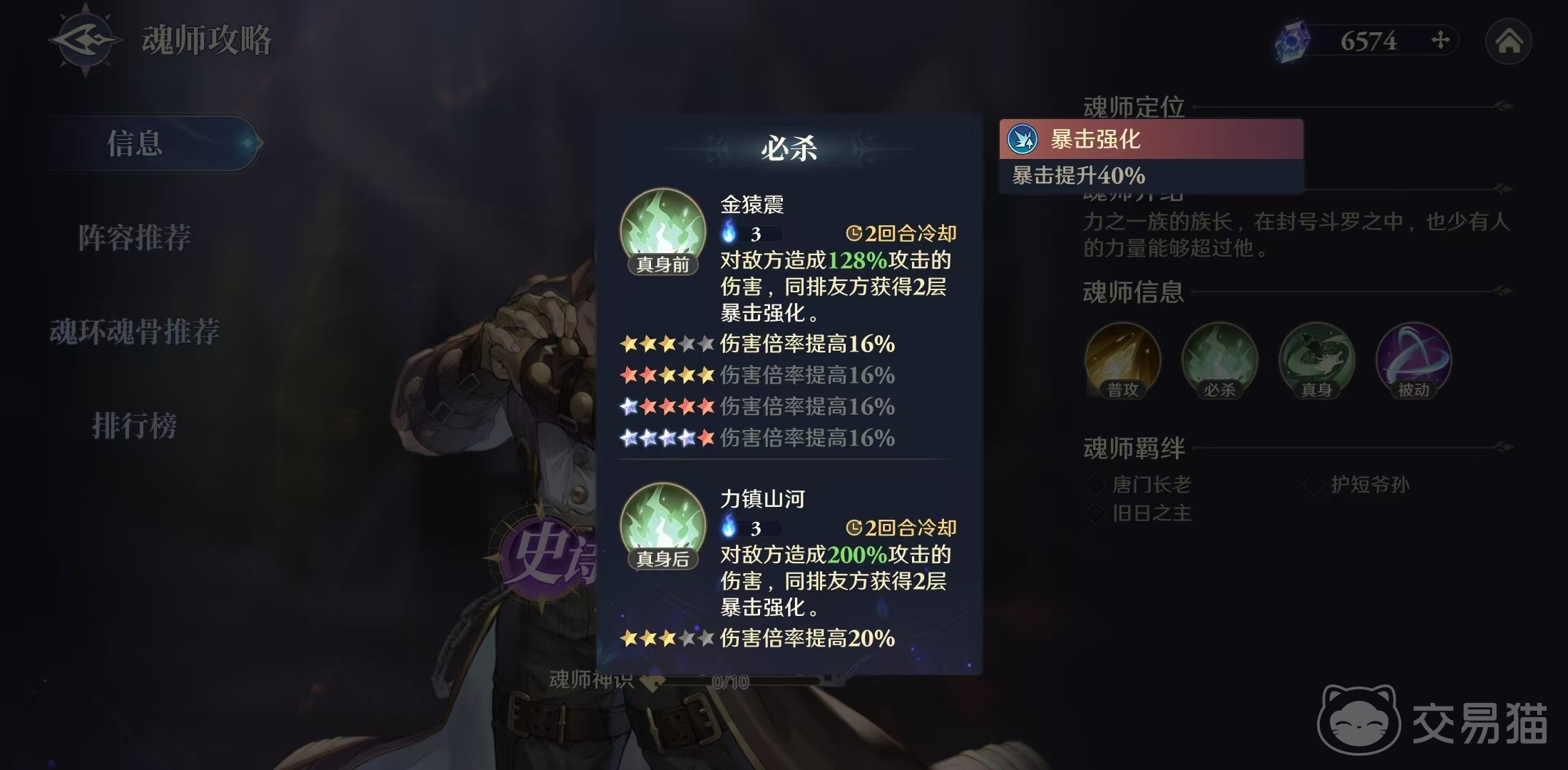 必杀为金猿震,对敌方造成攻击伤害后,同排友方获得两层暴击强化,提升40%暴击几率。在武魂真身释放之后变为力镇山河,除了造成伤害更高之外,同排队友同样获得两层暴击强化。这对于队友的伤害提升是很有帮助的,在搭配的时候,泰坦一定要和主力输出放到一起,这样才能享受到暴击所带来的加成。自身其他被动技能为泰坦神力,使武魂真身状态下普攻触发无法恢复的概率提升到100%。磐石之佑,当生命首次低于50%的时候,获得两层魂技强化,使魂技造成的最终伤害提升。还有极力抗敌,自身魂技击杀目标后技能冷却重置为零。