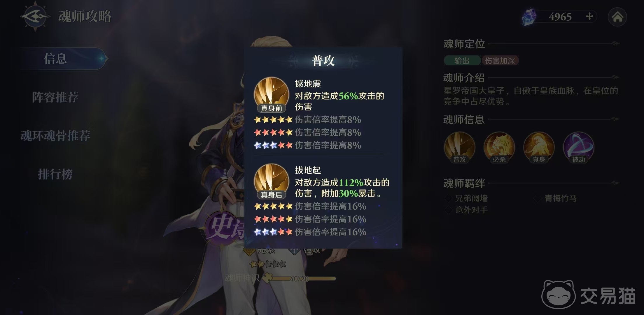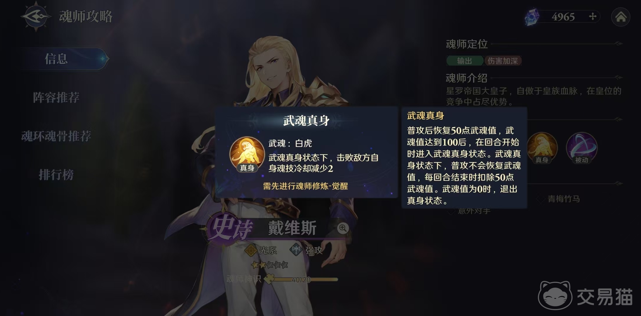 戴维斯的武魂真身是白虎,在此状态下击败敌人后,自身魂技冷却减少2,这样的武魂真身状态还是比较有优势的,可以加快输出节奏。在真身之前普攻为撼地震,对敌方造成56%的伤害,真身之后变成拔地起,造成伤害提升为112%,同时附加30%暴击。这样普攻依靠武魂真身下的暴击加成,可以给对方造成很强的输出效果。