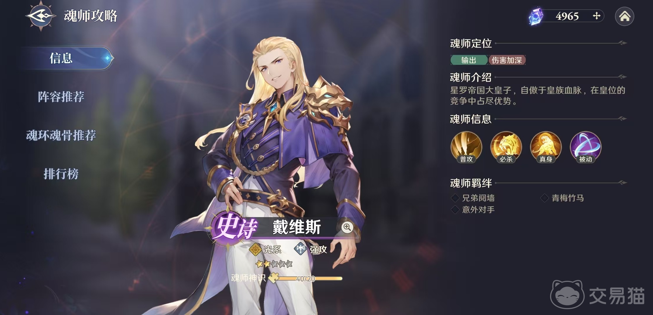 对于熟悉斗罗大陆的玩家来说,戴维斯不是一个陌生的名字,他是星斗帝国大皇子,也是一名强攻系魂师,在游戏中戴维斯被设计成了光系的史诗级品质人物,今天小编就来讲一下斗罗大陆逆转时空戴维斯好用吗。戴维斯在战斗中的定位是输出和伤害加深,虽然自身只有史诗级的实力,但使用得当依然可以发挥出很好的输出效果。