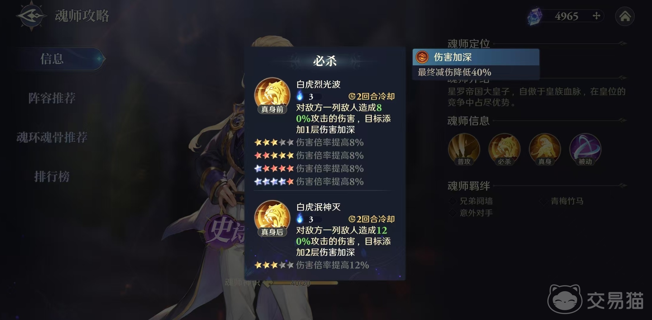 在普通状态下,必杀技为白虎烈光波,对敌方一列敌人造成80%攻击的伤害,为目标添加一层伤害加深效果。在武魂真身状态下,进化成了白虎泯神灭,对敌方一列敌人造成120%攻击的伤害,为目标添加两层伤害加深。戴维斯的必杀技在真身前后的效果差异比较接近,只是各个方面变得更加出色,伤害加深一层可以降低对方最终减伤40%,两层就可以达到80%。这样的效果也有助于队友集火秒掉对方的单位。