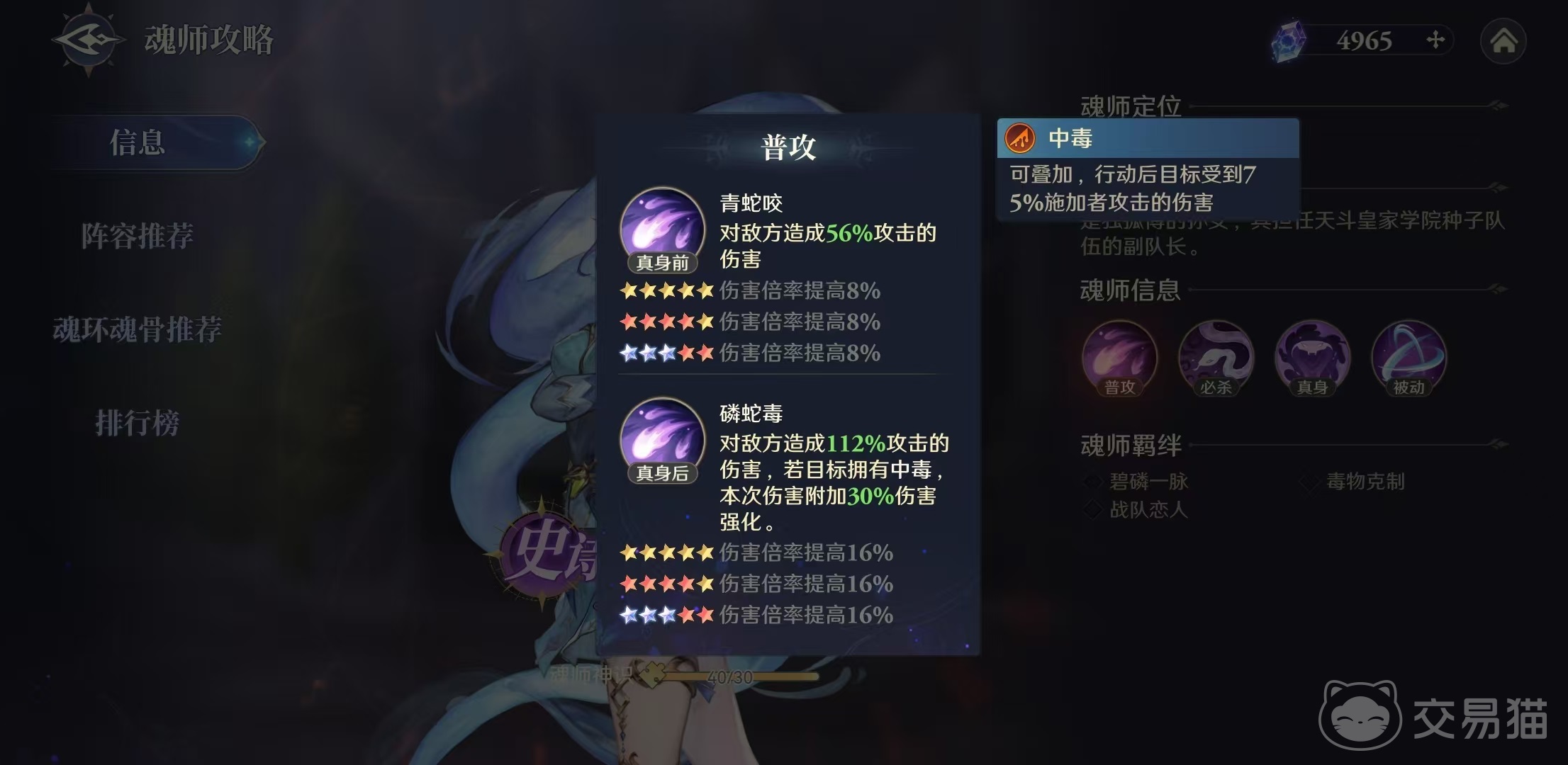 在武魂变身之前普攻为青蛇咬,能够造成56%攻击的伤害,提升星级后倍率还有所提升。在武魂真身状态下进化成碧鳞蛇毒,能够对目标造成112%攻击伤害,如果此时目标身上带有中毒效果,本次普攻将附加30%强化。依靠对方中毒之后打出强化后普攻,是独孤雁输出中很重要的方面,所以虽然自身输出围绕中毒,但是在阵容搭配的时候却不会走异常队,而是其他路线,接下来小编会介绍。