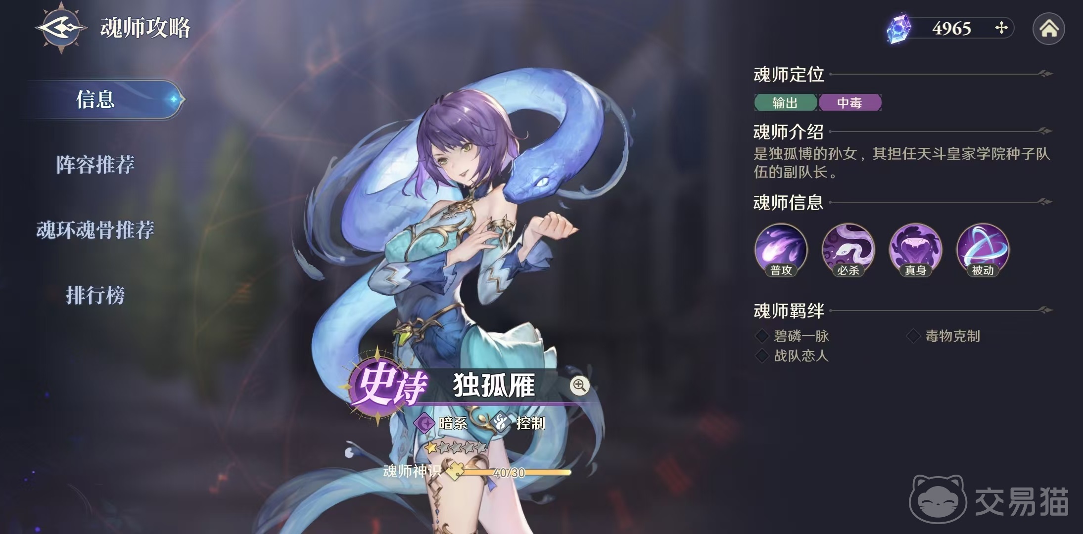 独孤雁是封号斗罗独孤博的孙女,本身也是天斗皇家学院种子队的副队长,自身属于暗系的控制类型魂师,小编今天就来给大家详细介绍一下斗罗大陆逆转时空独孤雁技能有哪些。作为一名史诗级品质的魂师,独孤雁可以利用自身输出和中毒的效果来为玩家打出伤害,当然前提是要了解清楚技能具体情况以及做出合适的搭配。
