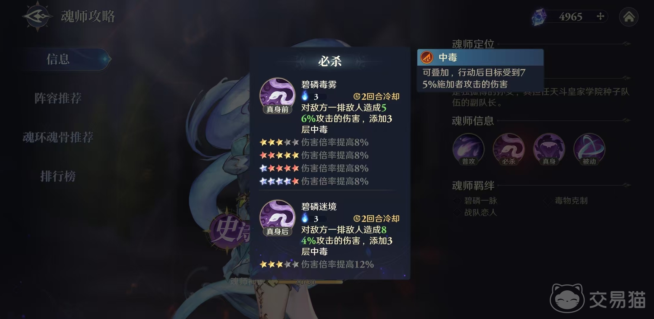 必杀技为碧磷毒雾,对于敌方一排目标造成伤害,添加三层中毒。在武魂真身之后,进化成碧磷迷境,伤害方面有所提升,但中毒层数不变,可以说独孤雁的武魂真身前后必杀技并没有明显的变化。总体来说就是依靠必杀来添加中毒,然后普攻输出伤害,所以阵容方面小编选择走狂暴输出队类型。比较出色的搭配为龙公、蛇婆、朱竹云等,这样形成初阶阵容。后续可以融入鬼魅、月关和比比东的狂暴队。