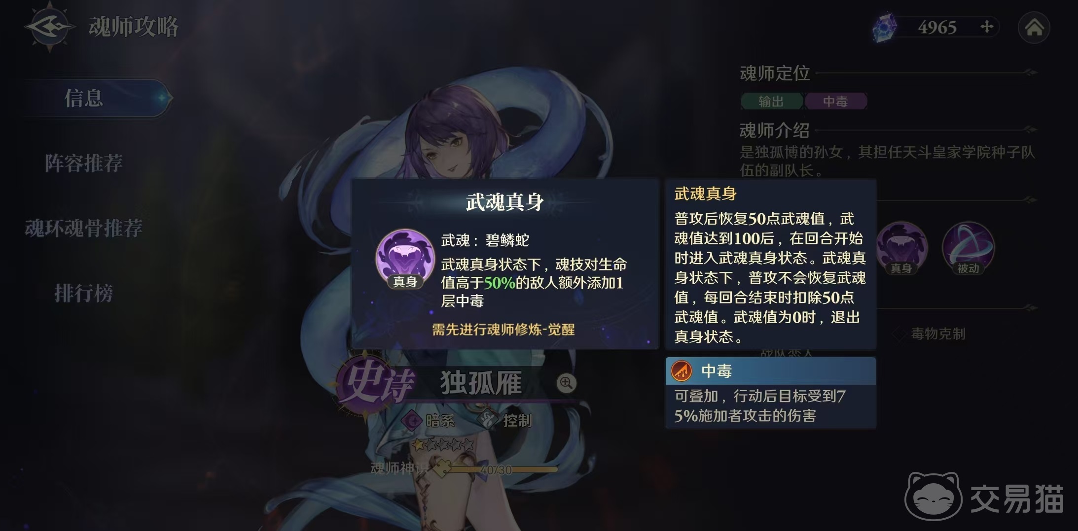 独孤雁的武魂为碧磷蛇,在武魂真身状态下,魂技可以对生命值高于50%的敌人额外添加一层中毒效果。中毒是属于可叠加异常状态类型,在行动后目标将会受到75%施加者攻击力的伤害,无论是哪个技能所添加的中毒都是同样的效果。