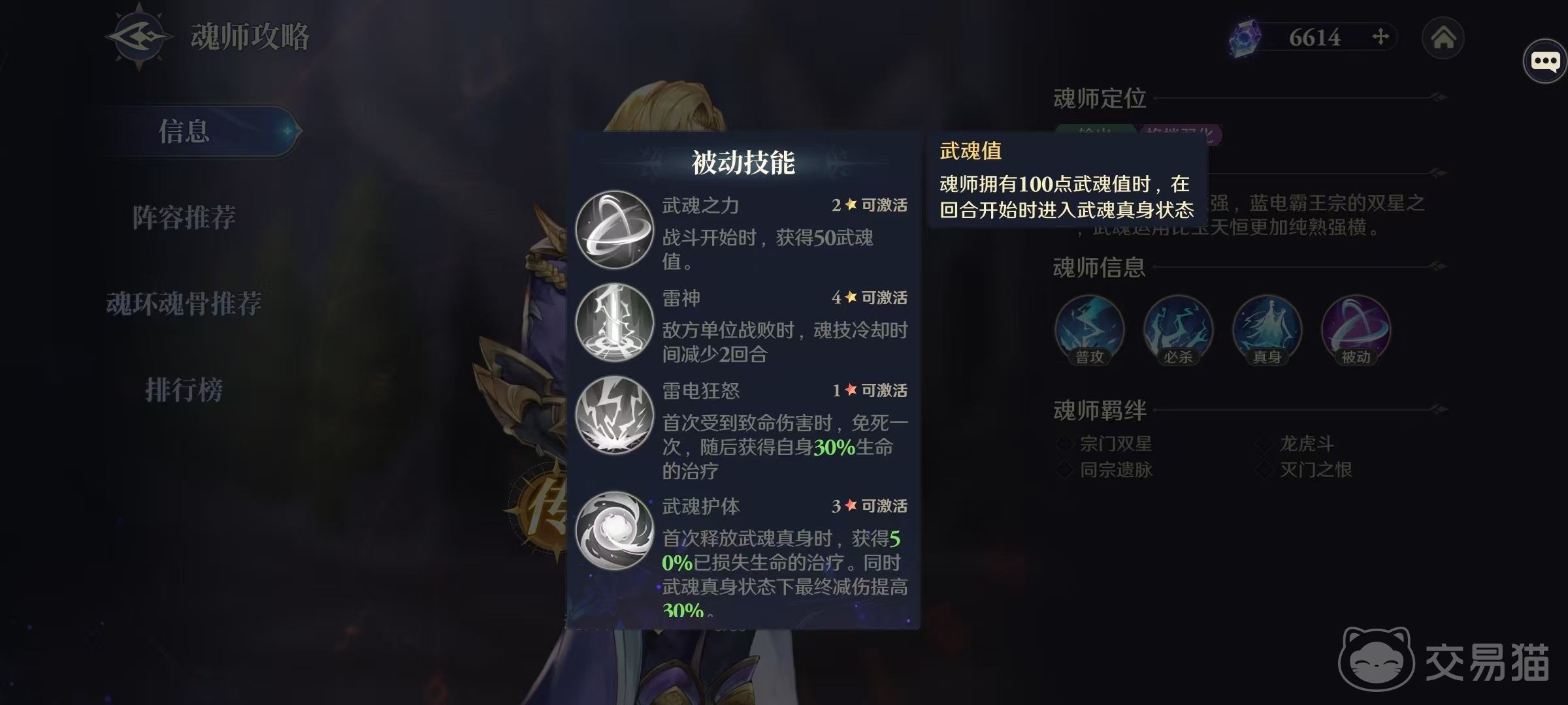被动方面,第1个雷神,敌方单位战败时,魂技冷却时间减少两回合,加快输出节奏。第2个雷电狂怒,首次受到致命伤害时可以免死,并获得30%的血量治疗。第3个蓝电激爆,自身魂技必定触发会心效果,造成1.4倍伤害。阵容搭配可以和奥斯卡、水冰儿、火舞、风啸天等一起组合,只要能造成异常效果都能加入进来。