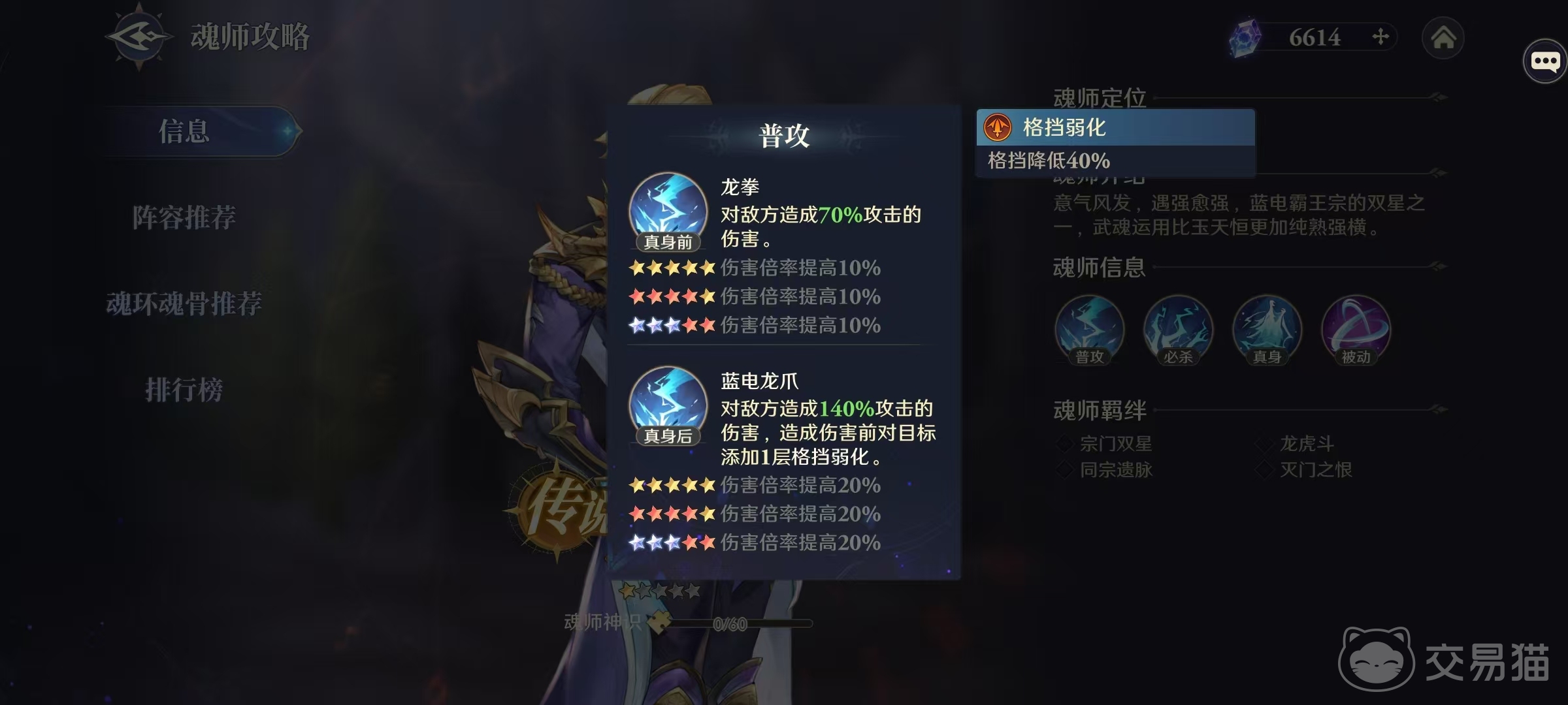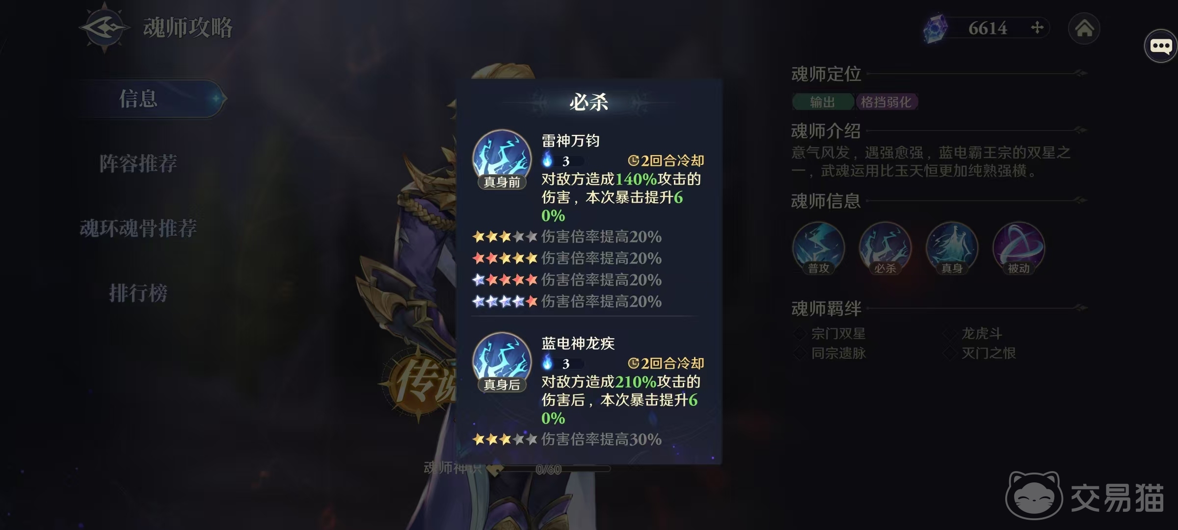 开启武魂真身之后的普攻蓝电龙爪伤害非常可观,还能够在造成伤害之前,为目标添加一层格挡弱化,降低40%格挡。这样降低之后对方就很难格挡住普攻伤害,对于一些肉盾来说很有效果。必杀技能雷神万钧,造成伤害的时候提高60%暴击,开启武魂真身后变为蓝电神龙疾,伤害更加可观,暴击同样是60%。这样的必杀效果也进一步奠定了玉天心在输出中的地位,只要能触发暴击,再加上伤害提升,可以直接秒掉对方的残血或者是脆皮。