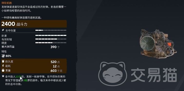 不过在射击前需要通过旋转枪管来启动,要求各位在战斗前进行准备,确保在遭遇敌人时可立即去进行开火,虽然说该武器的单发伤害不如其他武器高,但可通过连续射击来快速的累积伤害,且在连续击中敌人10次后能发射穿甲弹,逐步削弱敌方防御,由于该武器的后座力小,即便是在移动中也能保持稳定射击,十分的适合追击时使用。
