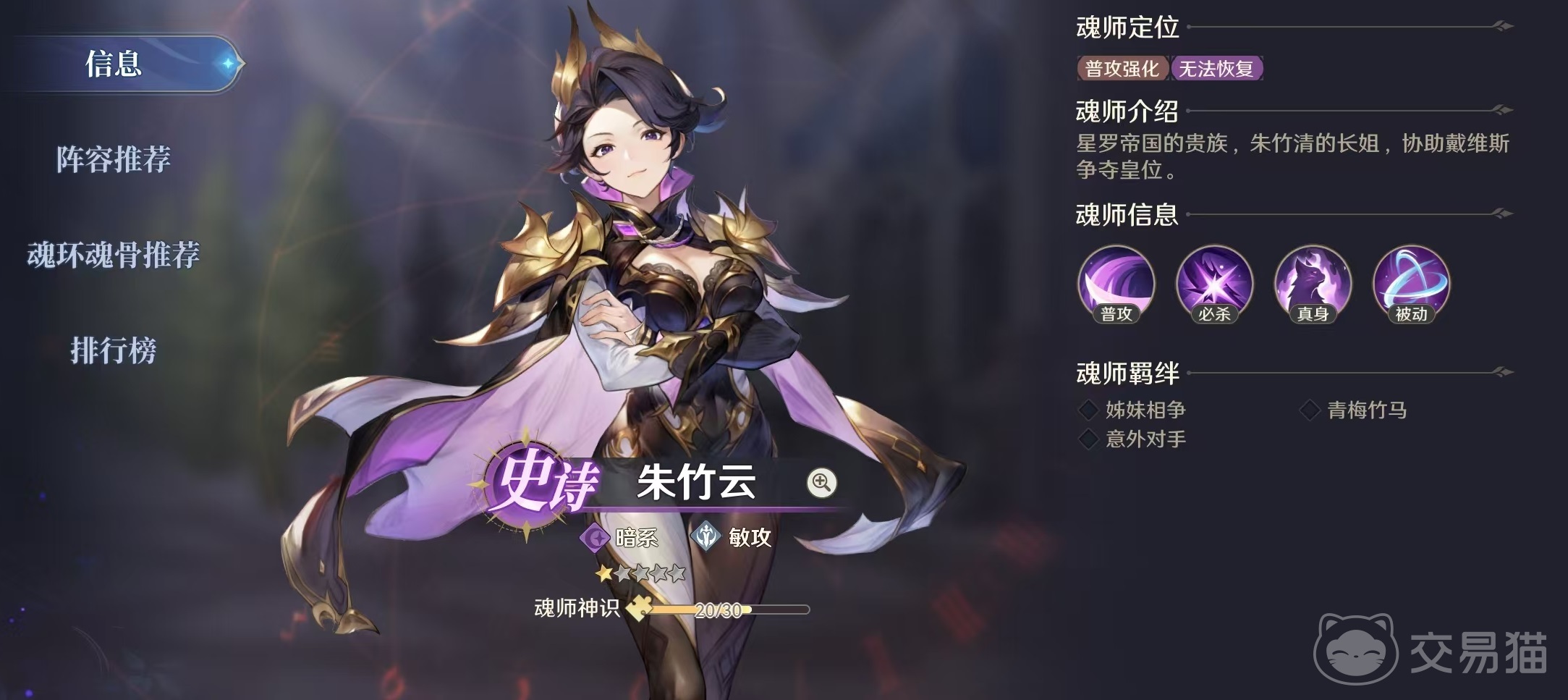 今天小编要给大家介绍的是朱竹云,大家千万要和朱竹清区分清楚,是完全不一样的魂师,朱竹云是朱竹清长姐,也是星罗帝国的贵族,在游戏中属于暗系敏攻魂师,小编就来讲一下斗罗大陆逆转时空朱竹云怎么样。对于朱竹云不是非常了解也没有关系,接下来看清楚技能效果后,就知道该如何去用了。