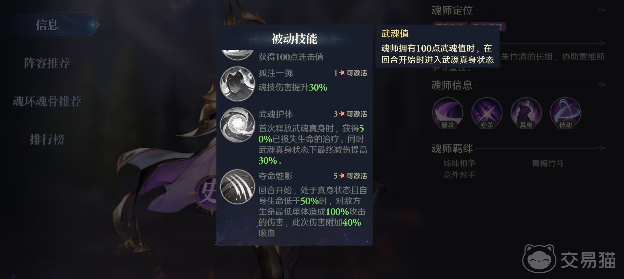 在被动技能方面,主要包括幽冥追风,武魂真身状态下击杀目标可以获得100点连击值。孤注一掷,提升30%魂技伤害。夺命魅影,回合开始时处于真身状态,且自身血量低于半血时,会对敌方生命最低的单位造成攻击伤害并附加吸血。有了这样的技能效果,阵容搭配可以选择狂暴队将,自身的残血输出以及限制治疗效果发挥出来。队友可以选择鬼魅、月关和比比东等,生命越低伤害越高,这样可以快速斩杀敌人。