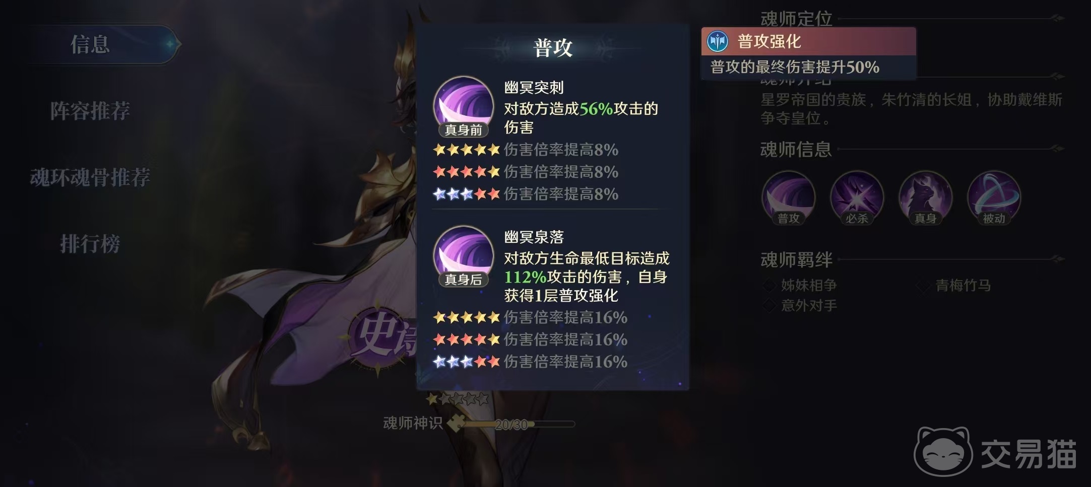 朱竹云的武魂真身是幽冥灵猫,开启之后普攻会降低目标25点武魂值,这一点是小编非常喜欢的方面,降低对方的武魂值之后,对方就很难开出自己的武魂真身,这样对于限制敌方来说有着很好的效果。普攻幽冥突刺造成攻击伤害,开启武魂真身之后,变为幽冥泉落,选择对方生命值最低的目标造成一次伤害,自身获得一层普攻强化,使普攻最终伤害提升50%。
