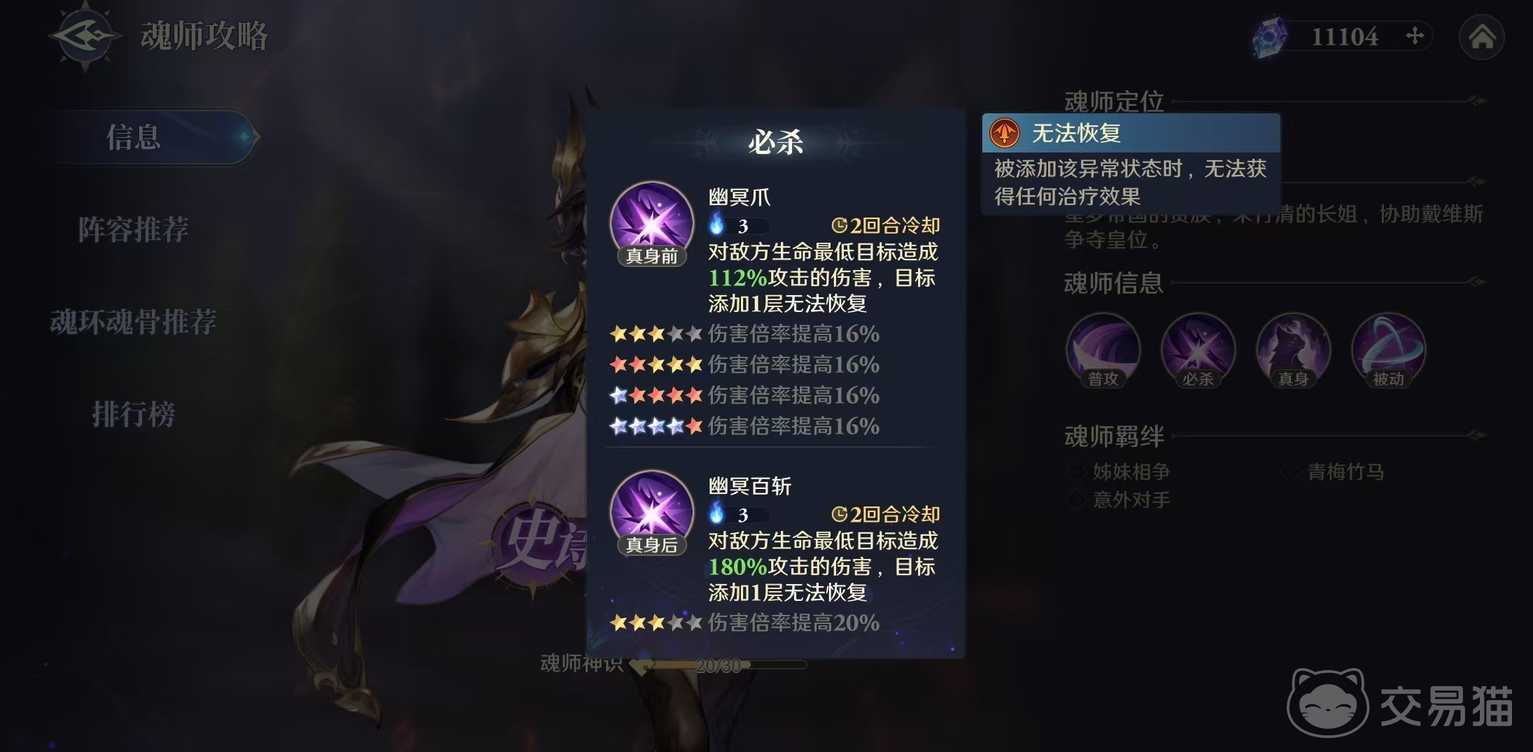 必杀技幽冥爪,选择敌方生命最低的目标造成攻击伤害,使目标获得一层无法恢复效果,接下来对方就不能获得任何治疗,对秒杀是很有帮助的。开启武魂真身之后变为幽冥百斩,造成的伤害更高。从技能效果来看,朱竹云的输出目标还是非常清楚的,会锁定对方血量最低的单位,这样能快速清理对方的残血。