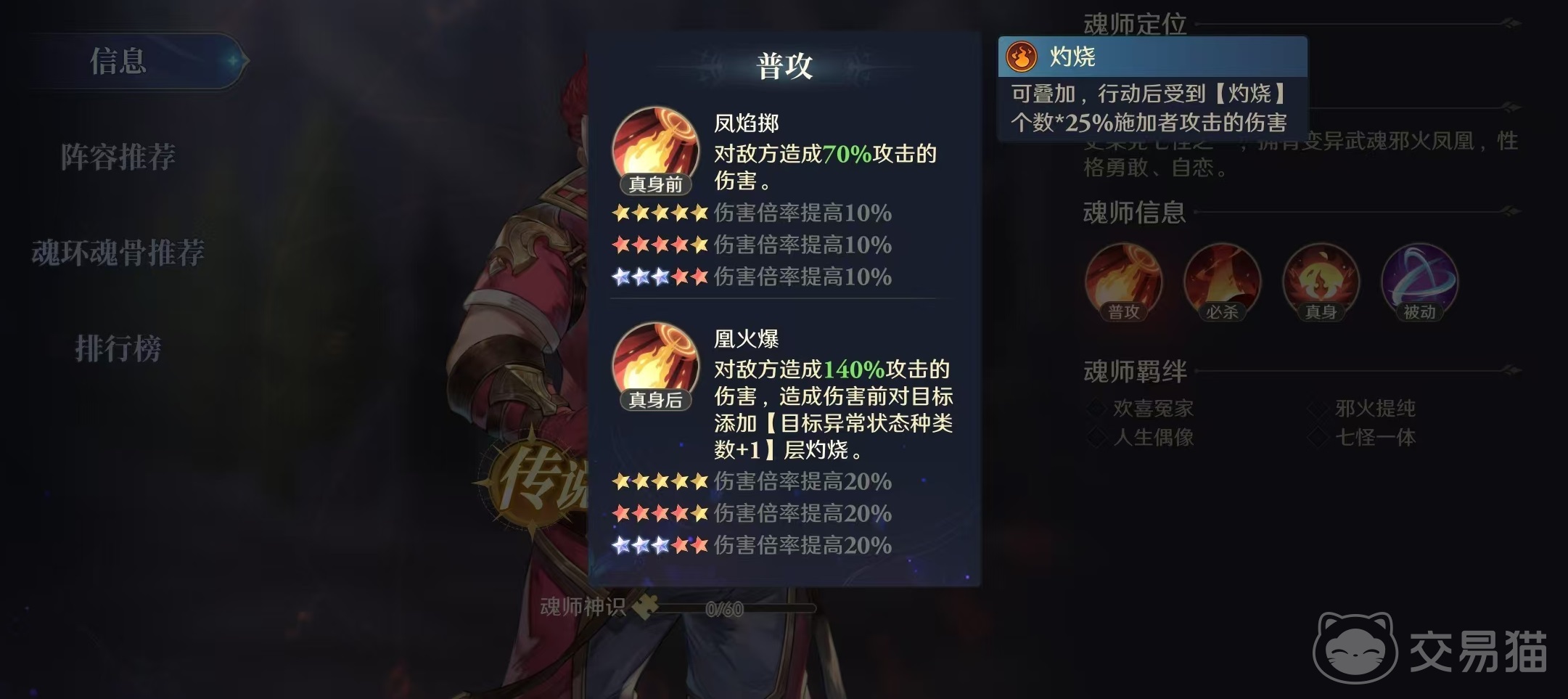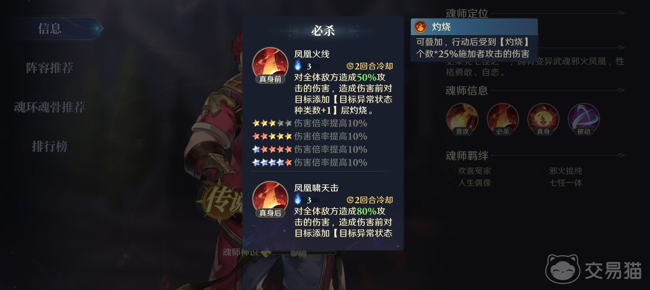 必杀技凤凰火线,对全体敌方目标造成50%攻击伤害,在造成伤害前对目标添加异常状态种类数加1的灼烧效果。武魂真身后变为凤凰啸天击,同样是全体输出,攻击伤害增加,其他效果不变。还有一些被动技能,例如欲火凤凰,能够在行动时按照目标灼烧层数增加连击值,再例如爆裂焚烧,对方单位战败时获得一点时空魂力等。