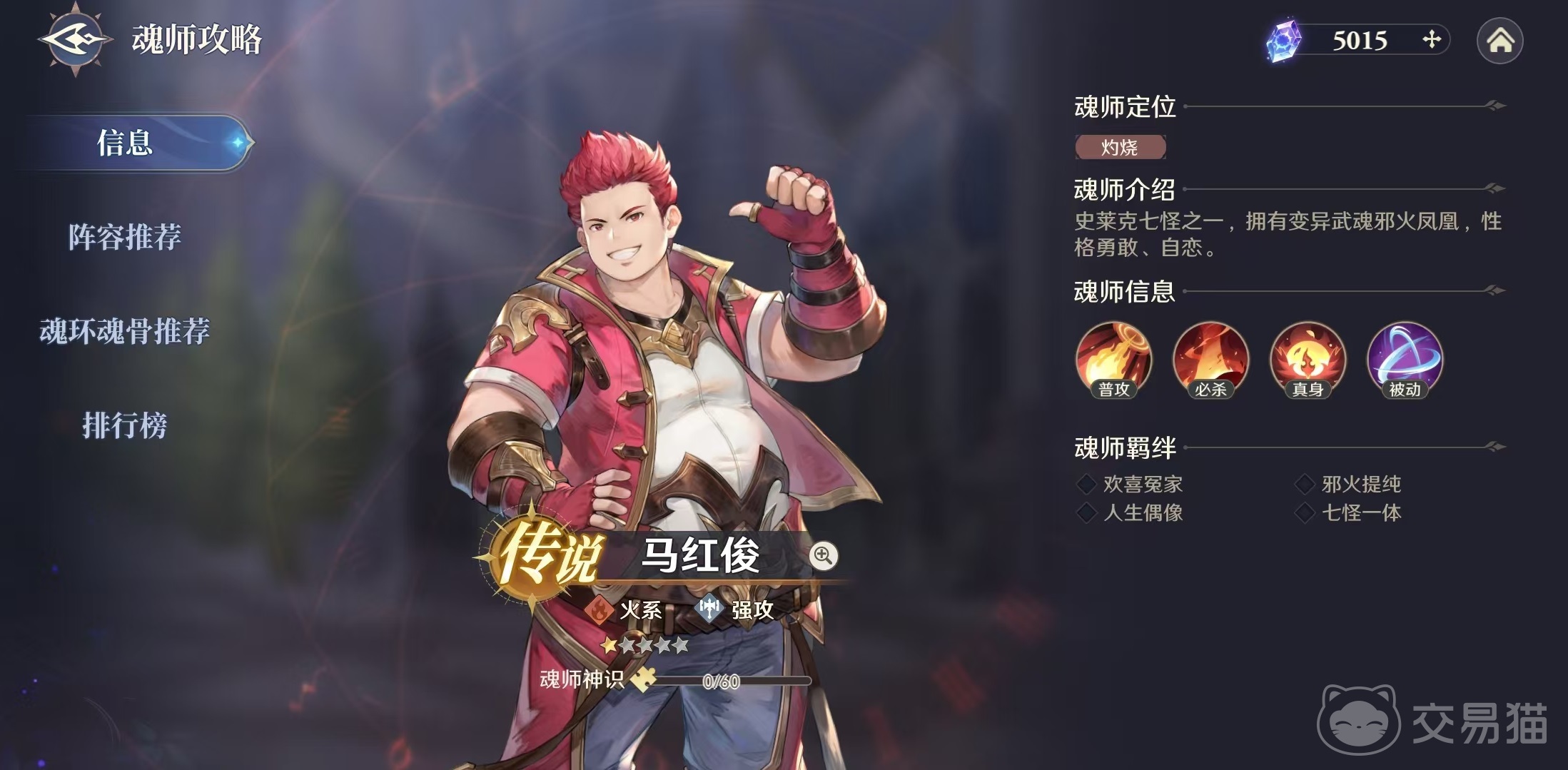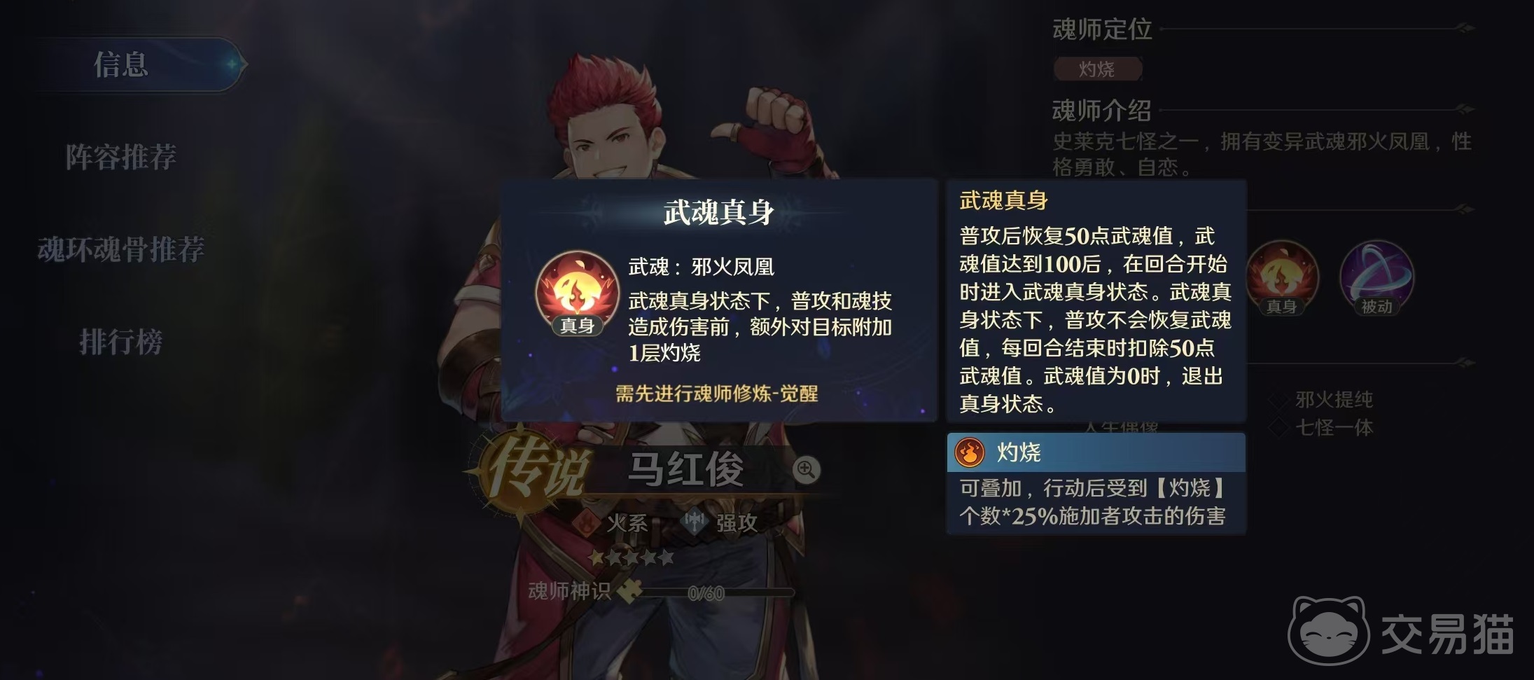 马红俊是现在出场频率比较高的传说级魂师之一,它作为火系强攻,也是有着成为核心的潜力。首先是自身的武魂真身邪火凤凰,在此状态下,无论是普攻还是魂技,造成伤害前都能额外为目标附加一层灼烧。灼烧是可叠加的状态之一,行动后受到灼烧个数所造成的伤害,每一层为25%,逐个叠加起来最后计算总量。