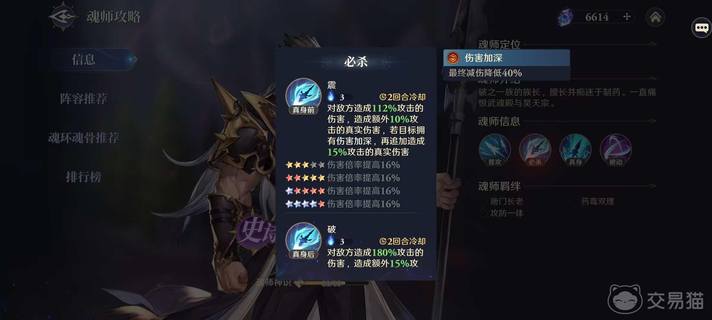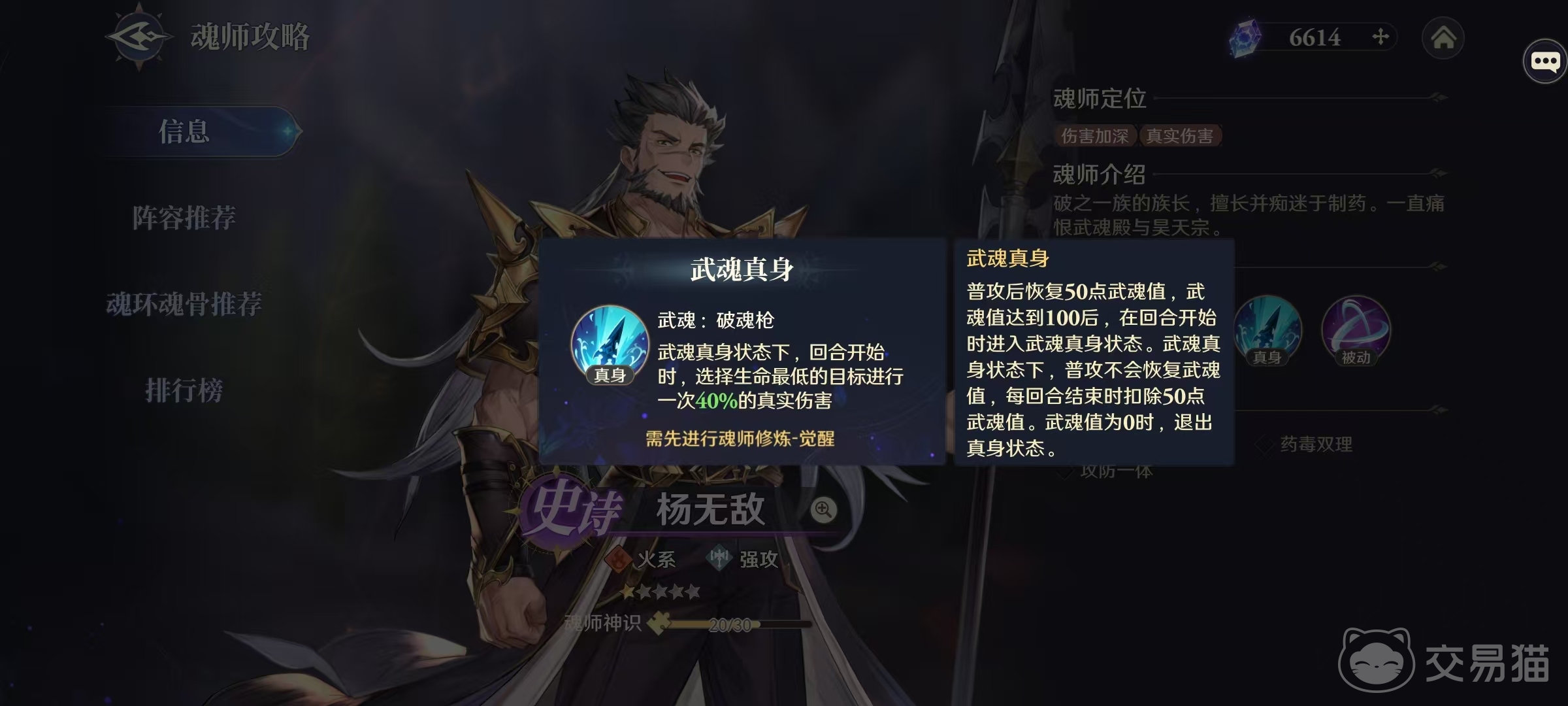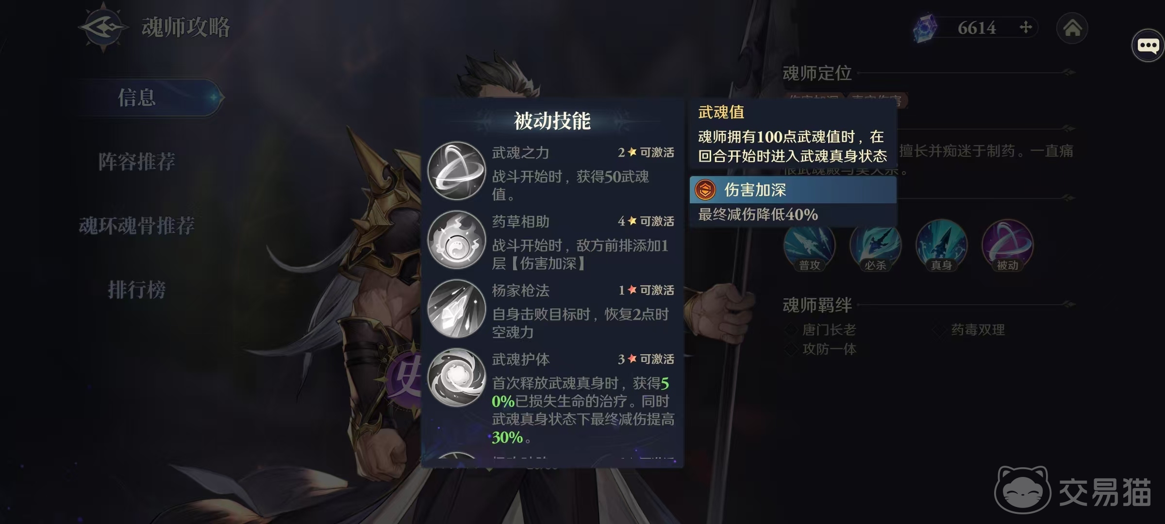 必杀技震,对敌方造成伤害后,额外造成一次10%攻击真实伤害,如果目标身上带有伤害加深,再追加一次15%攻击真实伤害。开启武魂真身之后变成破,除了单次攻击伤害更高之外,目标身上带有伤害加深所触发的追加攻击,也变成了20%攻击真实伤害。这些技能所触发的真实伤害令对方非常头疼,即使是肉盾面对杨无敌时也会被打掉很多血量。自身的被动也有着出色的伤害效果,第1个药草相助,战斗开始为敌方前排添加伤害加深。第2个杨家枪法,击败目标时恢复两点魂力,第3个极攻破阵,对方角色战败时,自身魂技冷却时间减少1。