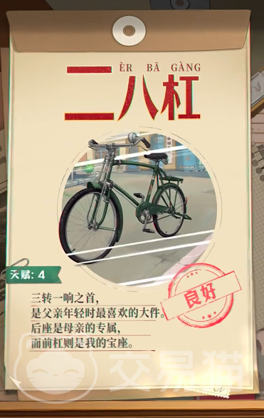 在游戏当中自行车被称为二八大杠,是90年的一个非常被大家喜欢的三大件之一,也被老一代称为三转一响之首,游戏当中该款再遇的评定为良好天赋为四等级,目前对于很多刚入坑的新手玩家来说是必选的优质载具,而且其获得方式难度系数也并不是很高,小编接下来详细为大家说一说。