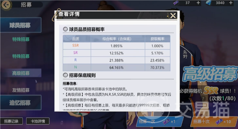 另外的池子绝对王者招募池中会有牛岛供玩家抽取,这里会讲一下如果在其他地方抽到了牛岛还要不要继续在这个池子抽。这里有两个绝对要补的情况出现,第一个情况就是由于这个池子保底180抽会出SSR,如果你在这个数量内还有10抽就抽到保底SSR,那么你一定要补到SSR出现;第二个情况就是如果你的钻石足够,牛岛这个角色一定要上到共鸣6,因此要继续抽这个池子,牛岛这个角色升了共鸣会有超大的能力变化,因此非常值得投资。