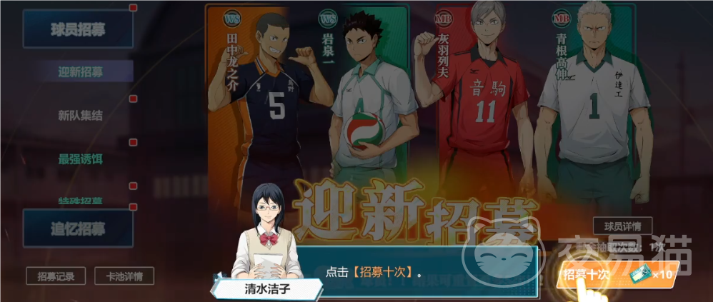 首先迎新招募池里面会有4个SSR的角色,分别是田中、岩泉、灰羽和青根,这个角色池最多可以重置五次,每次都必定会获得一名SSR角色,但是上限仅一名, 这个池子最强的角色有两位,一位是岩泉一,他简单来说就是万能的角色,第一招技能王牌的实力可以提升5%的意识和10%的力量,使得他基础的能力非常优秀,但是更为厉害的技能其实是第三招被动技能副队长的激励,只要岩泉在场上这招就可以让我方所有球员提升6%的力量,因为是百分比计算所以越到后期越强。