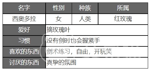 爱好是摘玫瑰叶,剑术练习,自由,开玩笑,生活习惯是没有剑时也会握紧手,这可能是她随时准备战斗的一种表现,西奥多拉作为一名以火焰属性为主的战士,她一般擅长近距离的战斗和控制,在战斗中大家可以利用她的技能组合控制战场。