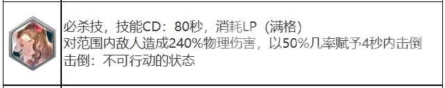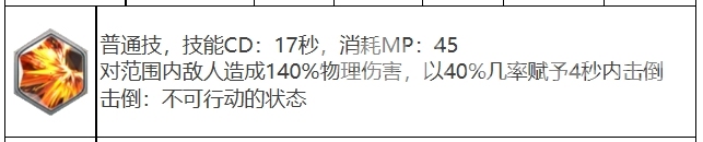 普通技能技能CD是17秒,消耗MP不算多45点,效果则是对范围内敌人造成140%物理伤害,有40%几率赋予4秒内击倒效果,击倒是一种使敌人暂时无法行动的状态,这为西奥多拉提供了良好的控场能力,而必杀技显然要好用很多,必杀技的技能CD是80秒,消耗LP需要满格,从这就可以看出来效果强度啦,效果是可以对范围内敌人造成240%物理伤害,有50%几率赋予4秒内击倒效果。