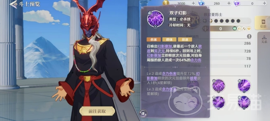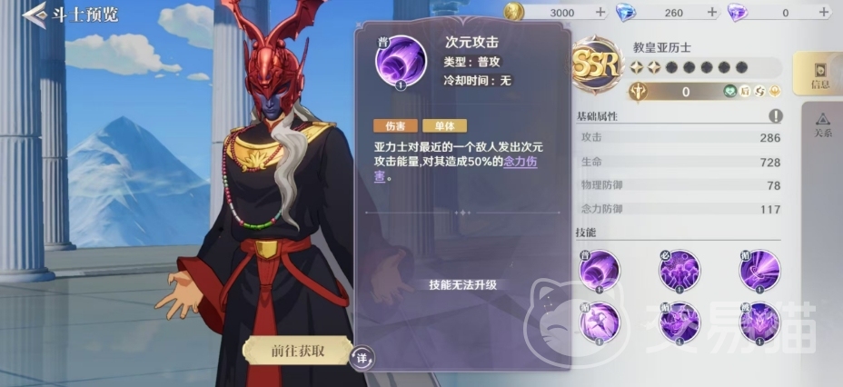 教皇亚历士是目前游戏中品质最高的SSR角色,他拥有次元攻击类型的普攻,没有冷却时间,能够对最近的一个敌人造成50%的念力伤害,亚历士的必杀技是双子幻影,这是一个群体放逐技能,他能够召唤出幻影撒加,将最近的一个敌人放逐到异次元,持续6秒,当敌人回到场上时,幻影撒加会立即释放次元扭曲,对周围敌人造成64%的念力伤害,当达到3级时,造成的念力伤害提升至80%。