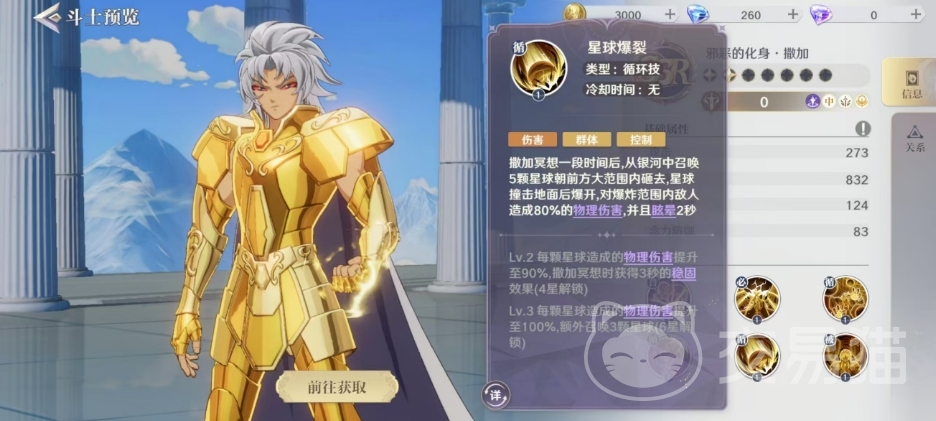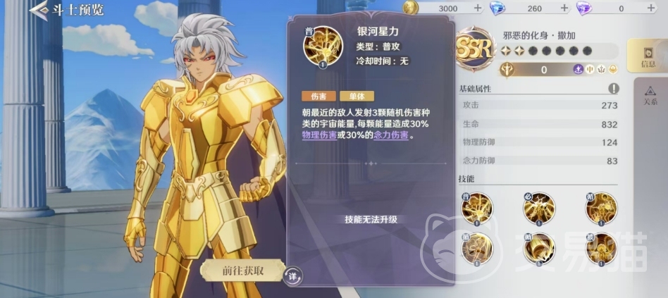 邪恶的化身撒加作为一个SSR品质的角色,有着强大的攻击力和控制能力,也是很多队伍当中的核心战力角色,他不仅拥有能够对敌人造成重大伤害的技能,而且具有控制战场的能力,撒加的普通攻击叫做银河星力,能够朝最近的敌人发射3颗随机伤害种类的宇宙能量,每颗能量造成30%物理伤害或30%的念力伤害,这个技能虽然简单但非常实用,能快速累积对敌人的伤害,而且就是能量伤害类型的技能。