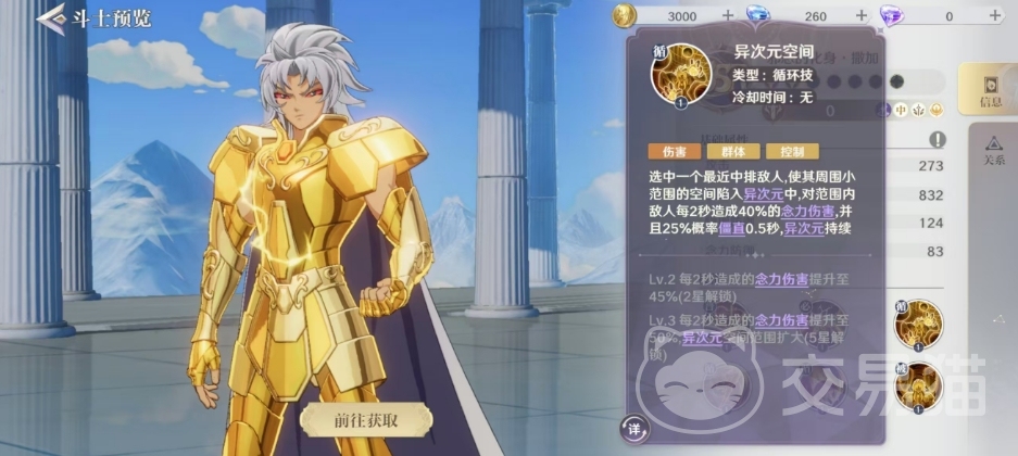 循环技能之一是异次元空间,它选中一个最近中排敌人,使其周围小范围的空间陷入异次元中,对范围内敌人每2秒造成40%的念力伤害,并且有25%概率僵直0.5秒,当此技能达到5星时,每2秒造成的念力伤害提升至50%,并且异次元空间范围扩大,所以大家想要撒加更好用的话,是一定要提升星级的。