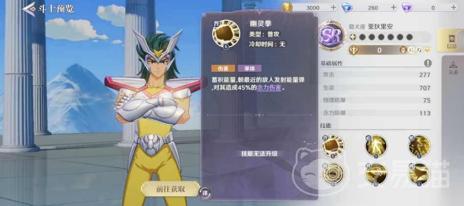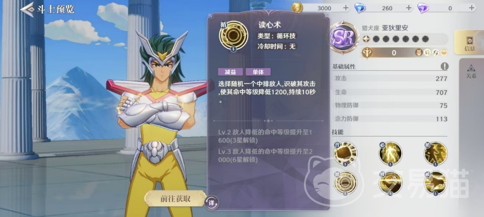 猎犬座的亚狄里安以其独特的紫色SR品质,展示出了他作为主要念力输出的角色定位效果,基础属性方面,亚狄里安拥有277的攻击、707的生命、75的物理防御和113的念力防御,这些数据为他在战场上的表现提供了一个培养方向,大家可以根据各个数值上面的优势来进行后期培养,作为一个紫色品质的角色,潜力还是有的。