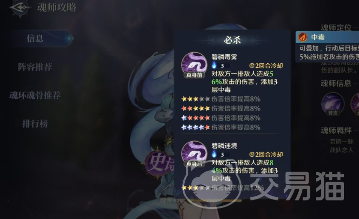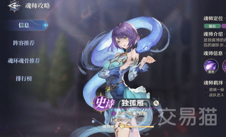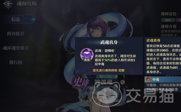 独孤雁在游戏中是一个暗属性的控制类魂师,她拥有可以给敌人增加毒属性buff的能力,在每一次的普通攻击之后,都可以对生命值低于50%的敌人造成一层的中毒效果,中毒效果是属于可以叠加的状态,独孤雁可以最多给敌人叠加五层的中毒效果,并且随着敌人的血量流失,该中毒效果的效率就更为明显,游戏为中毒效果设置了能够斩杀敌人的能力,如果上一次读条的中毒扣除倍率为下一次血量的最大值或大于下一次血量,那么该敌人就会直接死亡,所以携带独孤雁的战斗应当以下一回合的伤害结算来考虑。