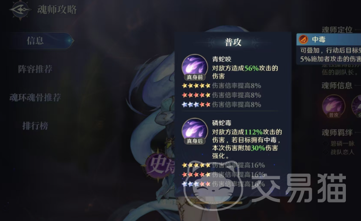 作为控制类的魂师,其技能附带有强制的强攻能力,在武魂真身的状态之下,独孤雁对敌人造成的中毒效果可以恢复自身的武魂值,可以说独孤雁对敌人造成越多的低buff,其真身的恢复效率也就越高,并且如果敌人身上带有中毒的debuff效果,独孤雁可以对敌人造成更多的伤害,所以她的伤害倍率基本上依靠着一次特殊技能一次普通攻击的伤害结算。