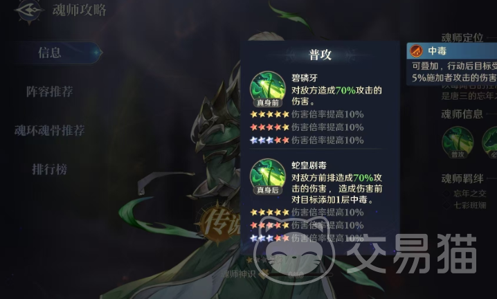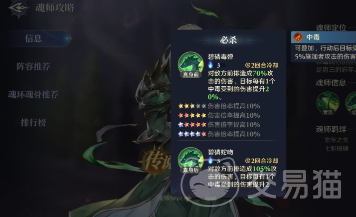 碧磷蛇皇是独孤家独孤博和独孤雁的专属利器,需要通过魂兽森林的狩猎或者进行抽卡获得,作为属性值非常高的武魂真身,他能够给敌人增加中毒的buff,并且该buff是可以叠加到五层的,只有毒属性暗属性的魂师才能够佩戴这个武魂真身,不仅如此它对于独孤博的伤害基础倍率加成非常高,因为独孤博的基础攻击是能够对敌人造成70%的伤害倍率,还能够对敌方的前排叠加中毒的效果,在搭乘了碧磷蛇皇武魂的加持之下,其伤害能够叠加到170%。