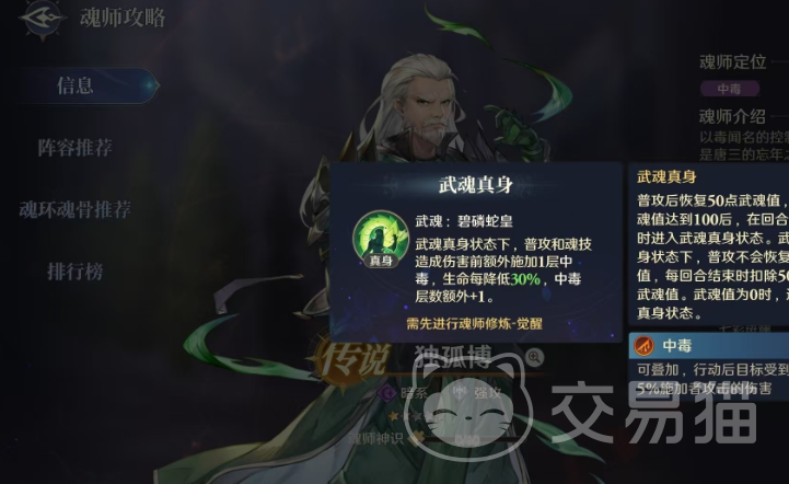 在碧磷蛇皇的武魂真身之下,独孤博可以使用必杀技能对敌人造成可观的伤害,并且最值得一提的是,无论是真身状态还是非真身状态,独孤博的普通攻击都能够给敌人叠加负面buff,并且每一层可以降低对方生命回复率的30%,还能够让对方每回合掉血5%,中毒的buff最多可以叠加到五层,随着武魂真身的等级提升,能够叠加的buff层数也会逐级升级,最高为八层。