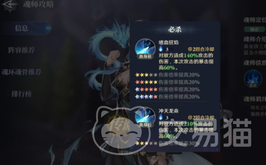 角色在游戏里有一个必杀技,名为嗜血狂焰,使用这个技能之后就可以给对方带来140%的伤害,而且在攻击之后能提升玩家60%的暴击率,攻击能力变强之后,在游戏里武魂真身还能进化,进化成通天龙炎之后能带来120%的攻击,同时角色的暴击率也会提升。