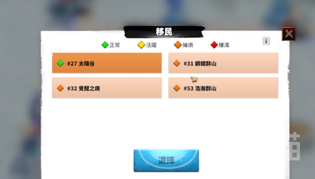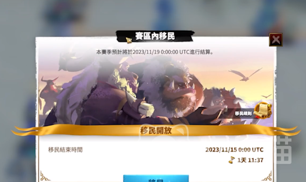 想要在游戏里移民的话,需要等到赛区结束之前,在这个时候游戏里都会有相应的移民选项,打开移民选项之后就会显示出可移民的时间,同时在这个页面上还会展现出来当前不同场景的移民状况,有正常也有相对比较拥挤和爆满的,已经爆满的地区是不支持移民的。