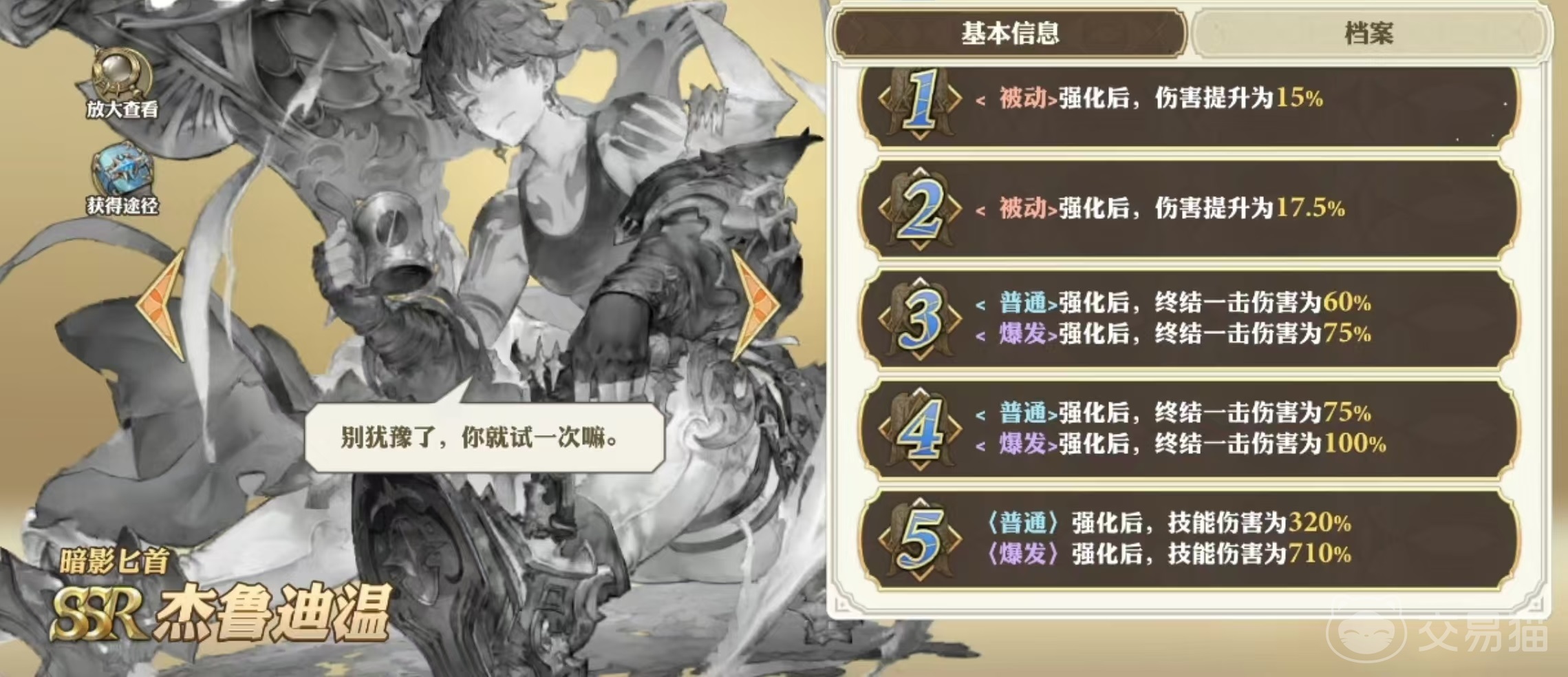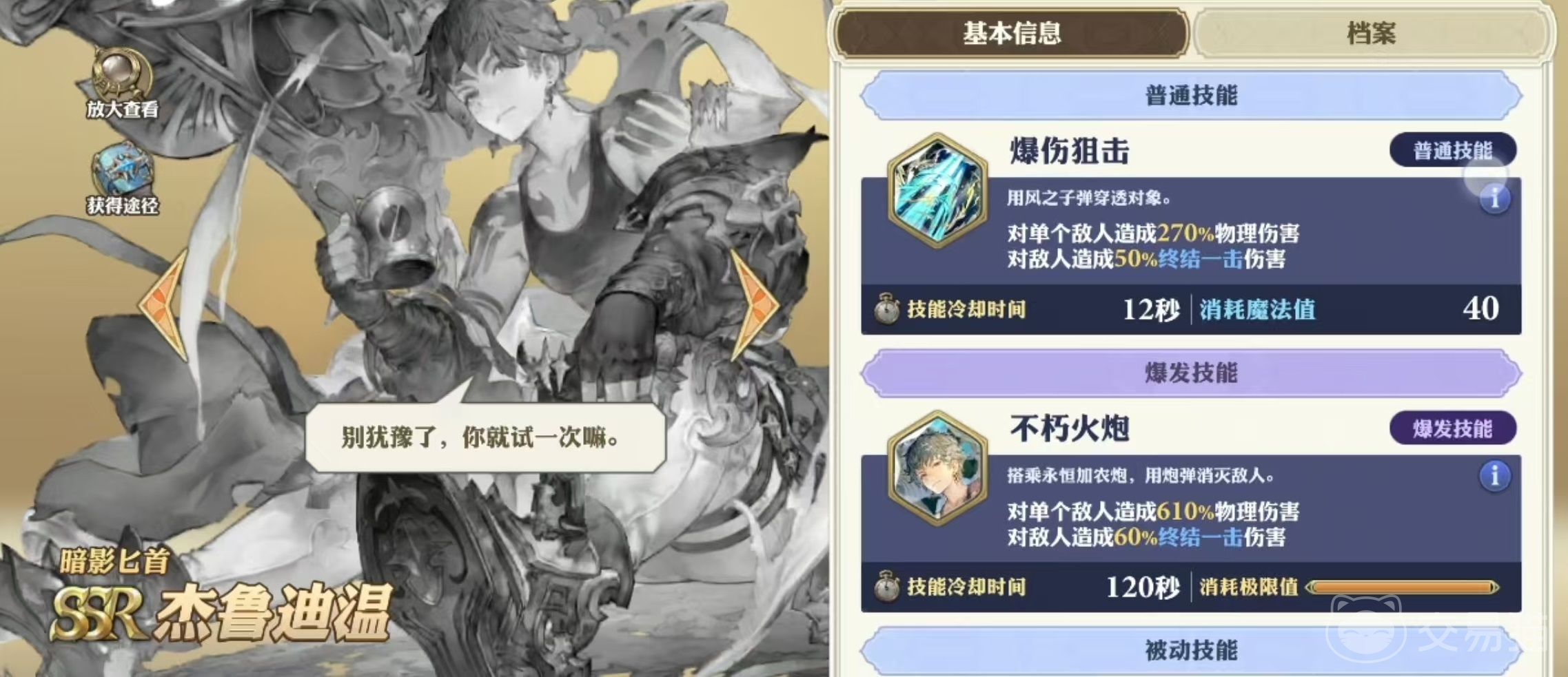 杰鲁迪温是非常出名的影卫,普通技能爆伤狙击,用风之子弹来穿透对象,对单个目标造成270%物理伤害,还能对敌人造成50%终结一击伤害,这样在单体输出的时候就会变得更加威胁,技能冷却时间12秒钟。