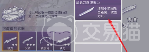 经过一番努力,终于拿到了延长刀身的效果,这时候再回到改造界面给铁刀来个“大变身”。看着改造后的铁刀,是不是感觉它更加威猛了?这把看似普通的铁刀,其实隐藏着不小的潜力,通过一番巧妙的改造,它就能摇身一变成为攻击范围更广威力更强的利器。这就是咱们自己动手,丰衣足食的乐趣所在。其实游戏里里不仅仅是铁刀,很多武器都可以通过改造来提升性能。
