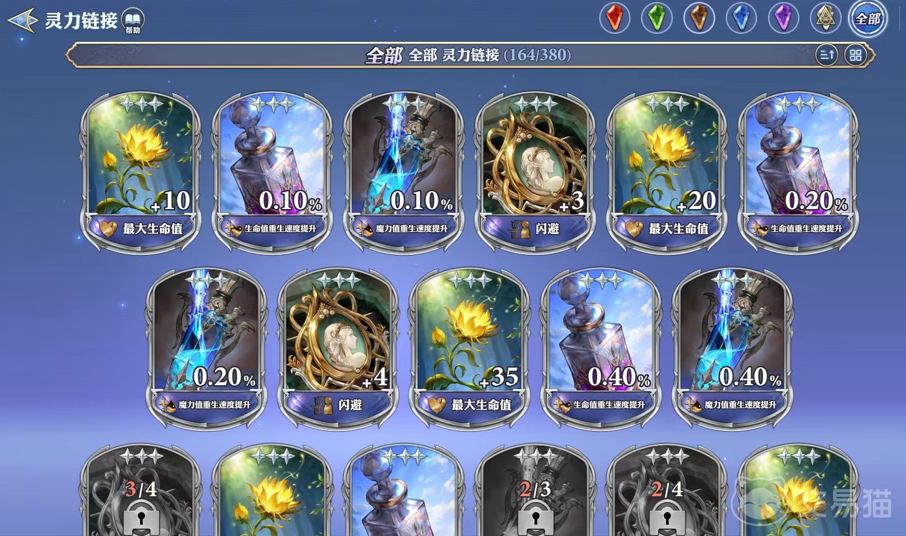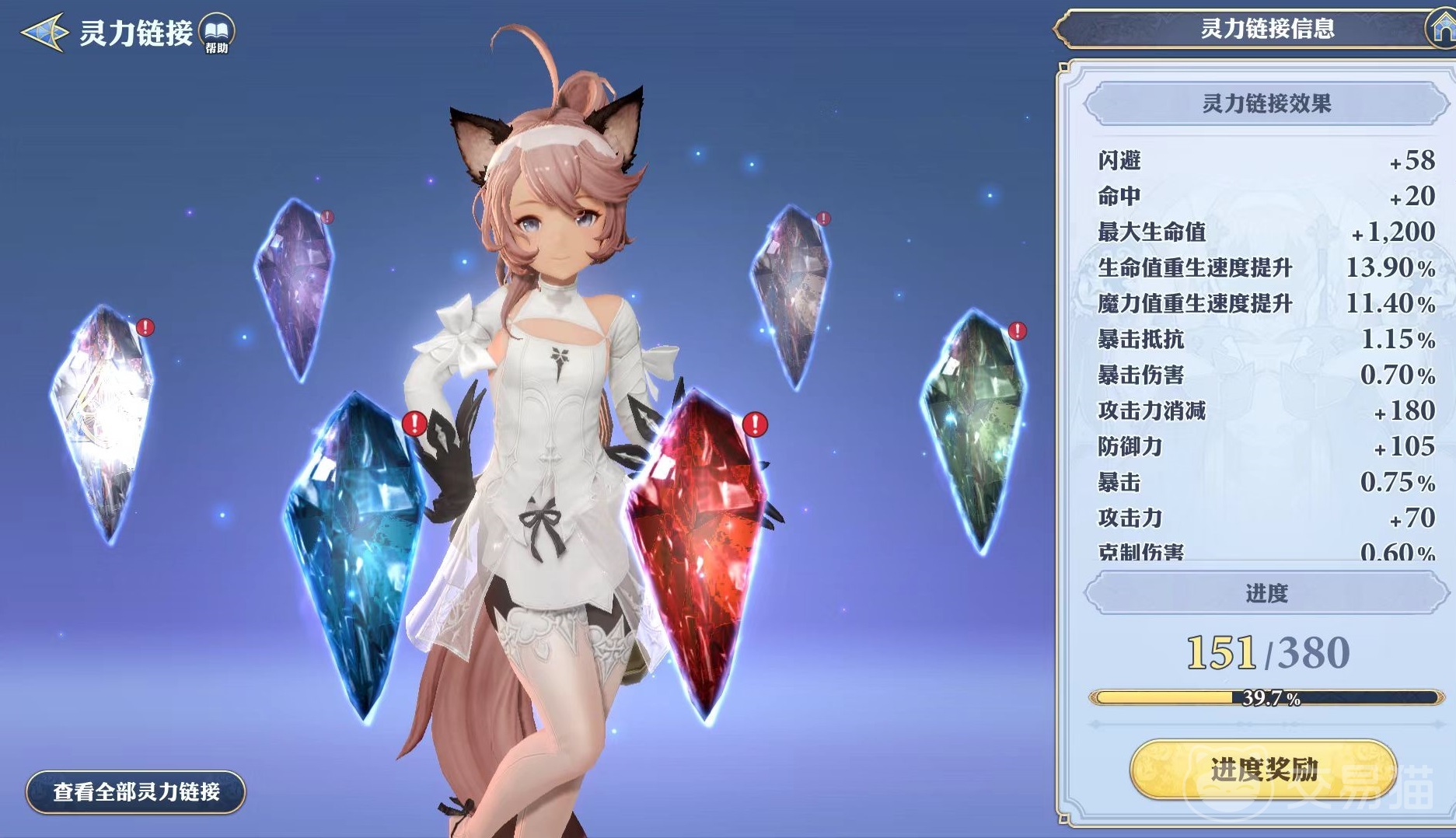 符合条件的格兰武器和神器可以开放灵力成长,获得附加属性,突破格兰武器和神器就可以开启对应槽位。灵力链接效果包括闪避、命中、最大生命值、暴击抵抗、暴击伤害等。这里有一个进度条,达到进度条之后就可以领取到进度奖励。