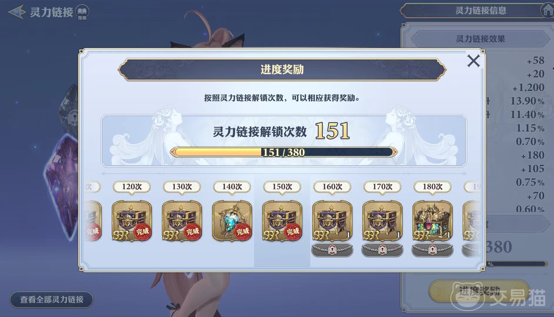 大家在灵力链接的界面中,可以直接点击查看目前所拥有的全部灵力链接。在其中可以选择自己需要的进行装备,大家一定好,要看好链接所带来的附加属性,这是战力的重要来源。然后按照链接解锁次数,可获得相应奖励。