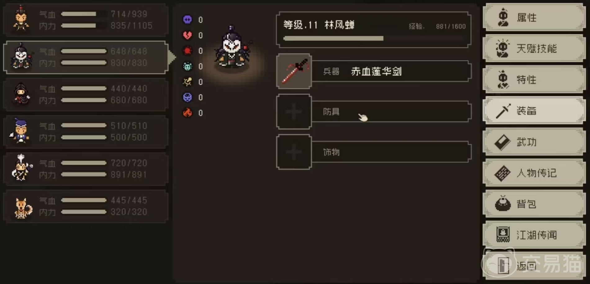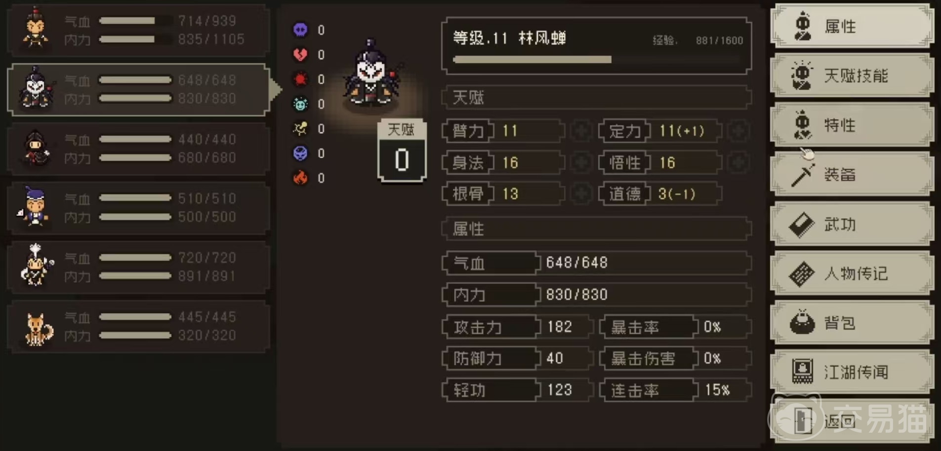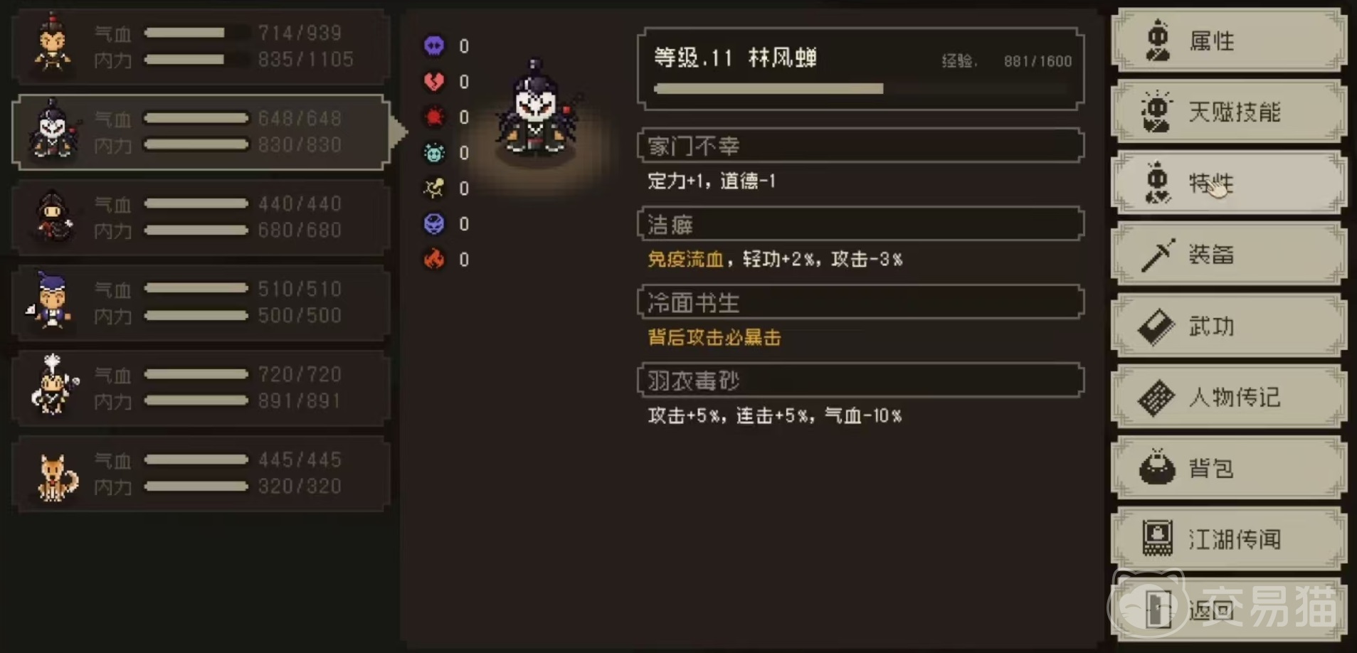 接下来看一下所具有的天赋,林风蝉天赋一共有四个,第一个是家门不幸,定力+1,道德-1。第二个是洁癖,能够免疫流血,轻功+2%,攻击-3%。第三个是冷面书生,背后必暴击,这一点在输出的时候比较占优势,和另外一个特性江湖黑手非常接近,但两者还有区别,那就是冷面书生不会降低攻击。第四个是羽衣毒砂,攻击+5%,连击+5%,气血-10%。有了这4个天赋带来的加成,在实战过程中的林风蝉也非常出色。