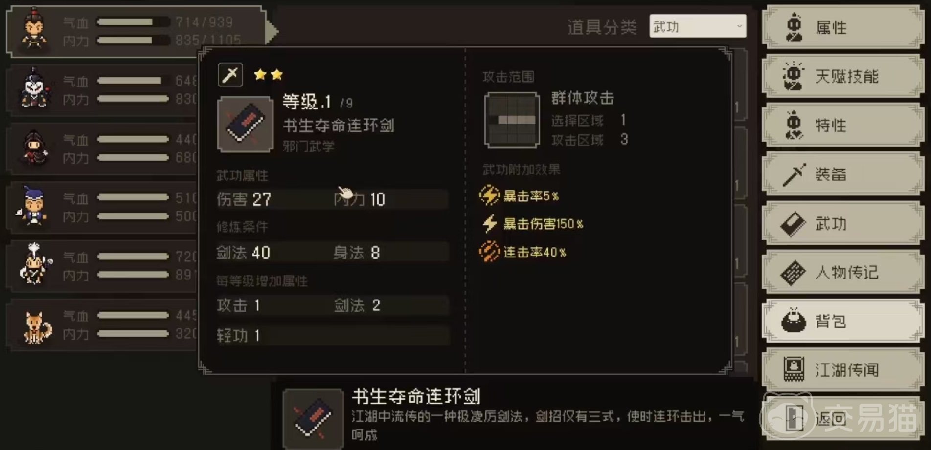 入队之后自带武功包括书生夺命连环剑和林风剑法,这两个都是羽衣线才有的武功类型。书生夺命连环剑攻击直线3格,附加属性为暴击率5%、暴击伤害150%、连击率80%。林风剑法的攻击范围是三格,属于群体输出类型,附加暴击率5%,暴击伤害150%,100%几率加轻功10,持续3回合。有了这样的武功,在群体伤害或单体伤害方面就都很出色,尤其是自身的轻功属性就更加优秀了。