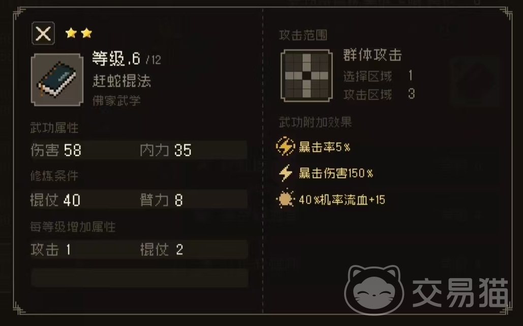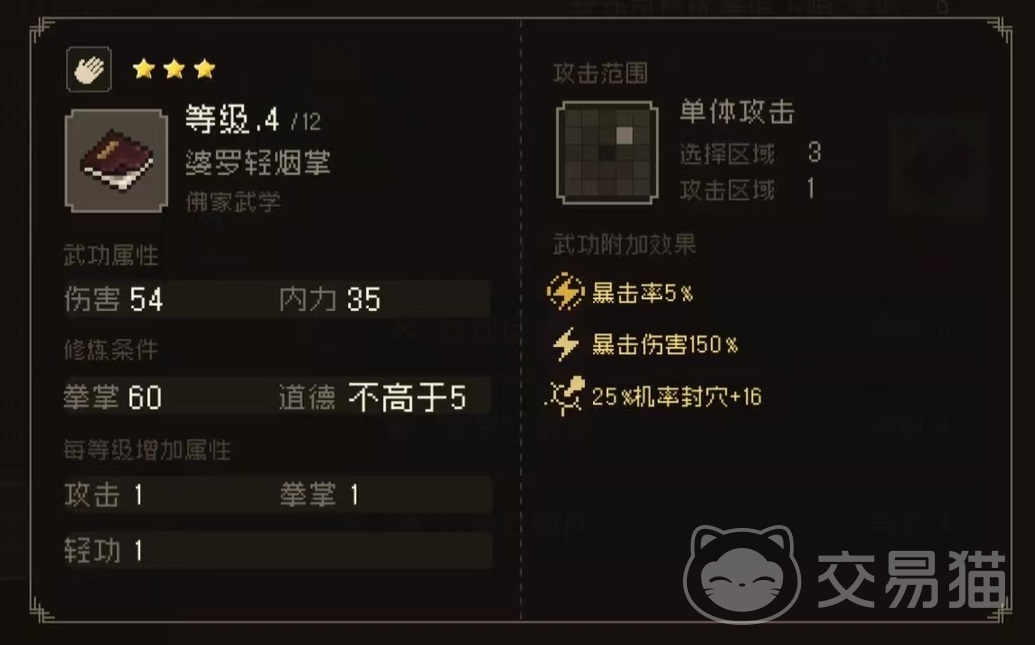 另外它还拥有三个武功,分别是赶蛇棍法、婆罗青烟掌和八步赶蝉阵。赶蛇棍法攻击范围是十字三格,暴击率5%,暴击伤害150%。婆罗青烟掌攻击范围三格单体,暴击率5%,暴击伤害150%,25%封穴加16。