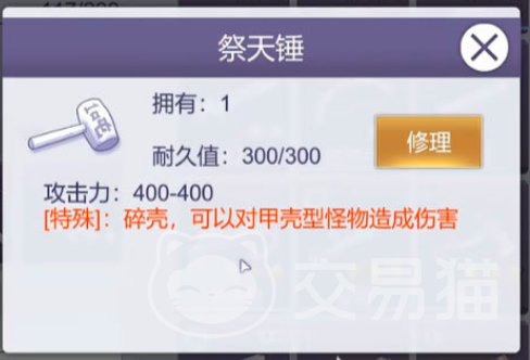 武器掉落的装备一共是三件,锤子,衣服和裤子,整体的属性还是很不错的,尤其是锤子,它的攻击力比钢锤提升了一倍多,还具有碎壳效果。