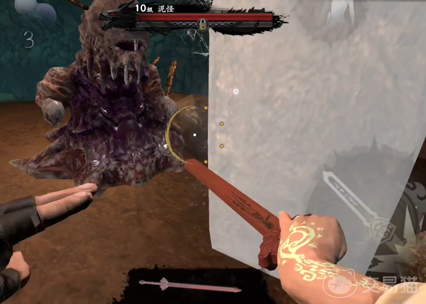 当大家看到有一个狭窄的长桥,并且两侧都是蓝色的火焰时,就代表已经接近目标地点了,这时候向右手边看去能发现有一个存档点,先存档了以后,走上桥,在右侧能看到有一个狭窄且弯曲的道路,这一段小心行走不然掉下去就完蛋了,路的尽头就是一块白色的石头,敲击以后会出现一个小boss,没有什么特殊机制直接打药加肉搏就能解决,然后就能拿到石料传送回牛彪处了。