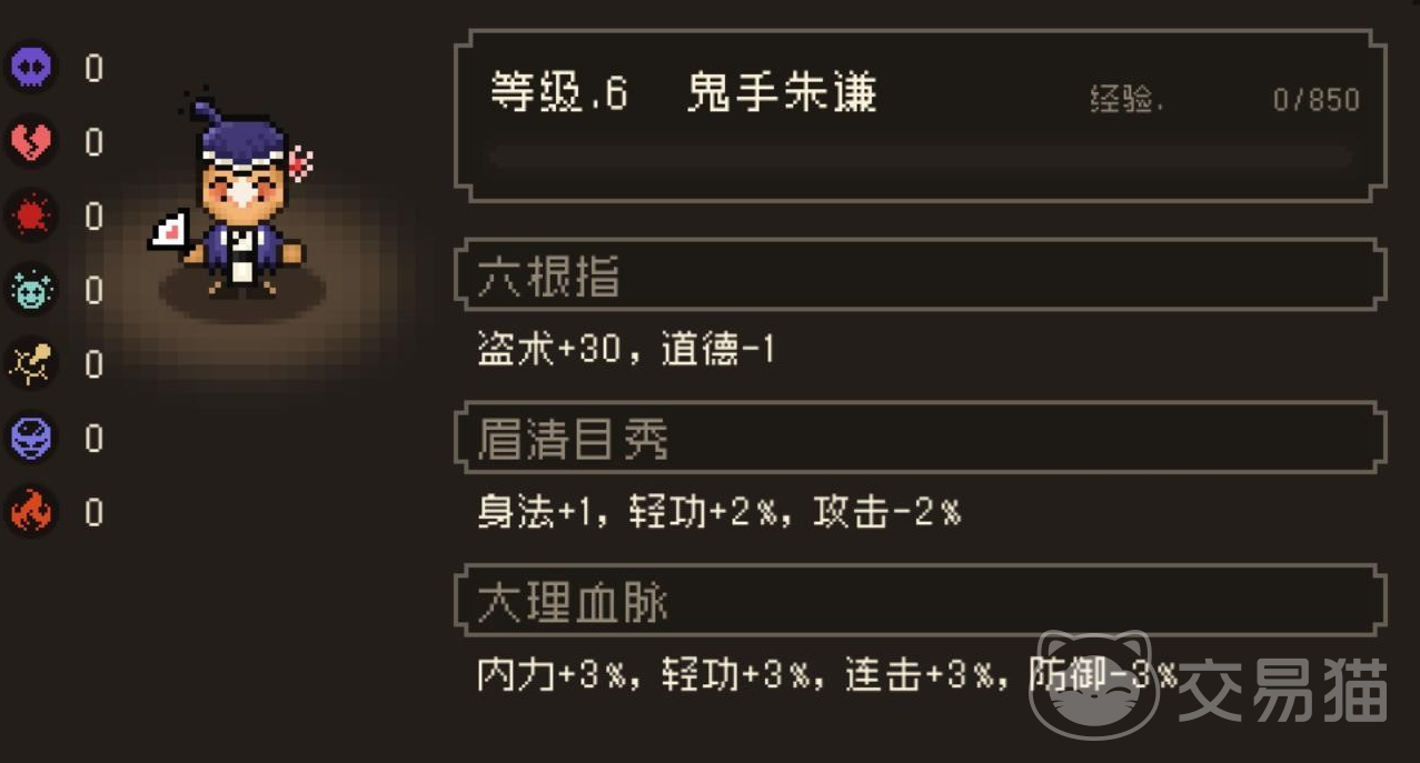 鬼手朱谦自身带有三个不同的天赋,第一个是六根指,能增加30点盗术,道德减少1点。第二个是眉清目秀,增加1点身法,2%轻功和攻击减少2%。第三个是大理血脉,使得内力增加3%,轻攻增加3%,连击加3%,防御减3%。