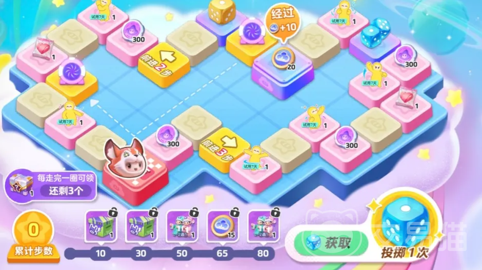 玩家们在游戏里面还可以去参加奇妙冒险之旅的游戏。这个游戏有些类似大富翁,玩家们可以扔出幸运骰子,之后满足一定的条件便可以获取到奖励。这些奖励之中还有着梁祝时装的奖励。