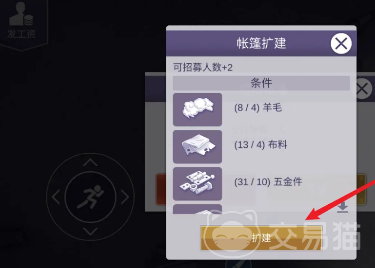 当然想要扩招队伍的条件现在也摆在了眼前,大家至少要准备四个羊毛、4个布料、10个五金部件以及其他材料。若是全都准备齐全的话,那么便可直接点击扩建即可。这些材料都可以选择在地图中的不同地方搜刮,不过这样会浪费不少时间。