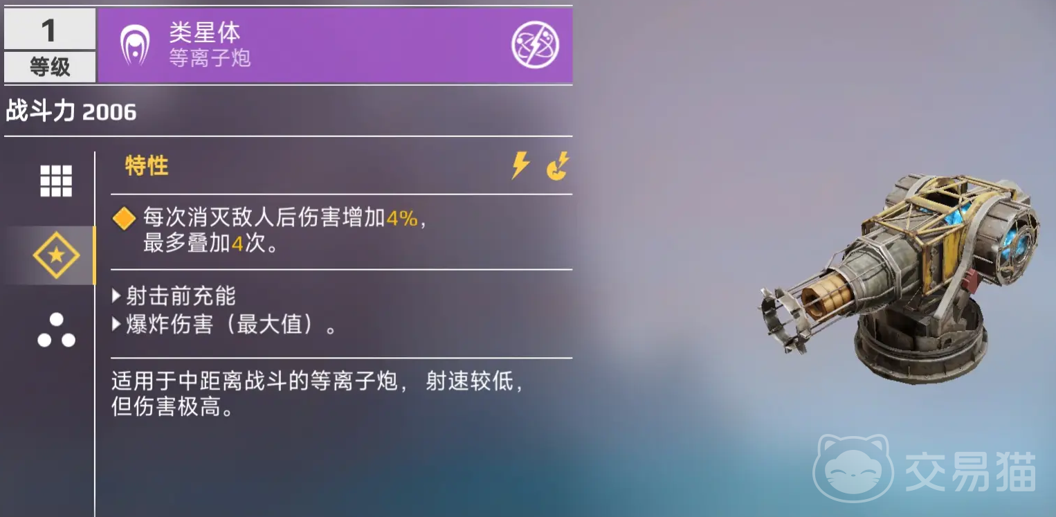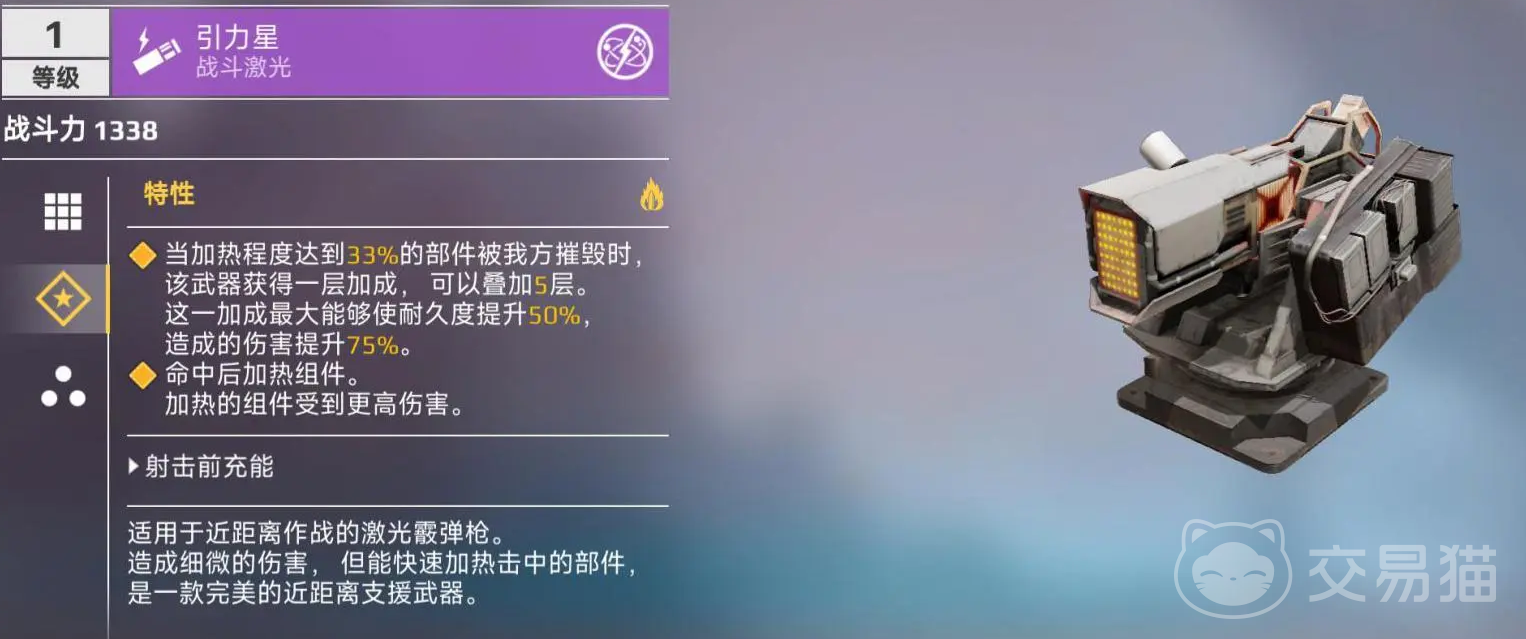 然后是触发,触发的攻击方式简单又直接,会先发射出激光束造成轻微伤害,再随后一轮的射击结束后再瞬间释放出巨大的伤害,这次的爆发性伤害足以穿透三个部件,最后要推荐的是引力星,引力星和其他能量武器可以说是截然不同,它具有霰弹枪的特性能对较低距离的敌人产生伤害,且拥有瞬间加热能力,它的技能是当受到加热的部件被摧毁后,能显著提升耐久度和造成的伤害,这样与能力叠加后,引力星的伤害会越来越高。